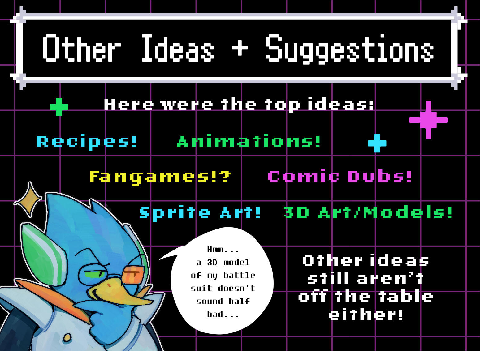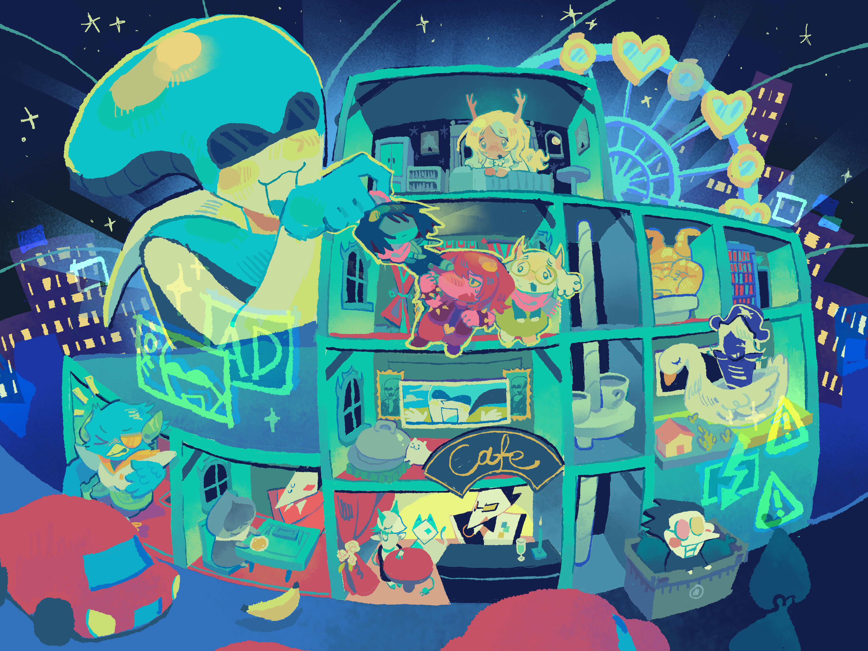 Thank you for taking the time to look through LIGHT IN THE DARK. So many people have truly worked so very hard on this project; it's thanks to everyone's perseverance that it was made into a reality.Deepest thank you to my fellow mods that made lots of art and helped me keep my head on through all this. Despite how much I try, I cannot do everything alone -- your help and contributions over the past year are invaluable.Another incredibly deep thank you to Cerise Kiitzuna, one of our talented musicians, for helping me put together this monster of a website. Everything that looks cool on here was her doing. Her hard work is truly inspiring, so please listen to her 9 minute song over and over.Lastly, we really want to thank you for engaging with this zine. A lot of people seem to think you need to contribute in order to be part of a fandom -- when in reality, all that matters is that you do your best to support the creators you like, even if it's just by dropping a like and moving on. You are a part of the fandom if you want to be. You don't need to prove it to anyone.Thank you for giving us -- and every one of these contributors -- your time of day. Art, writing, and music keep us all going, no matter what any of it is for. All that matters is that it brings us joy; it flexes our creative muscles.Here's to many more years of creation -- from everyone!- Goomy