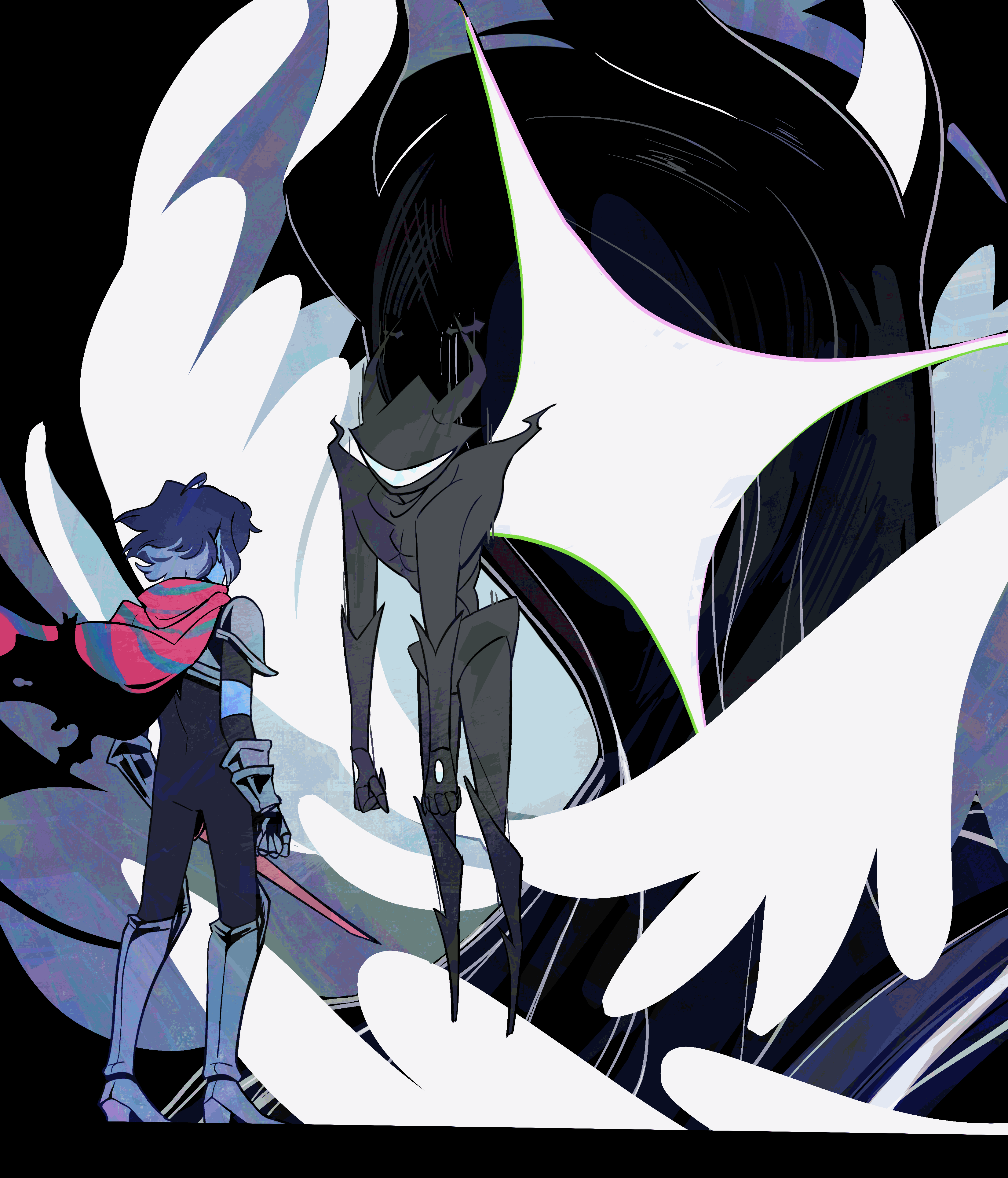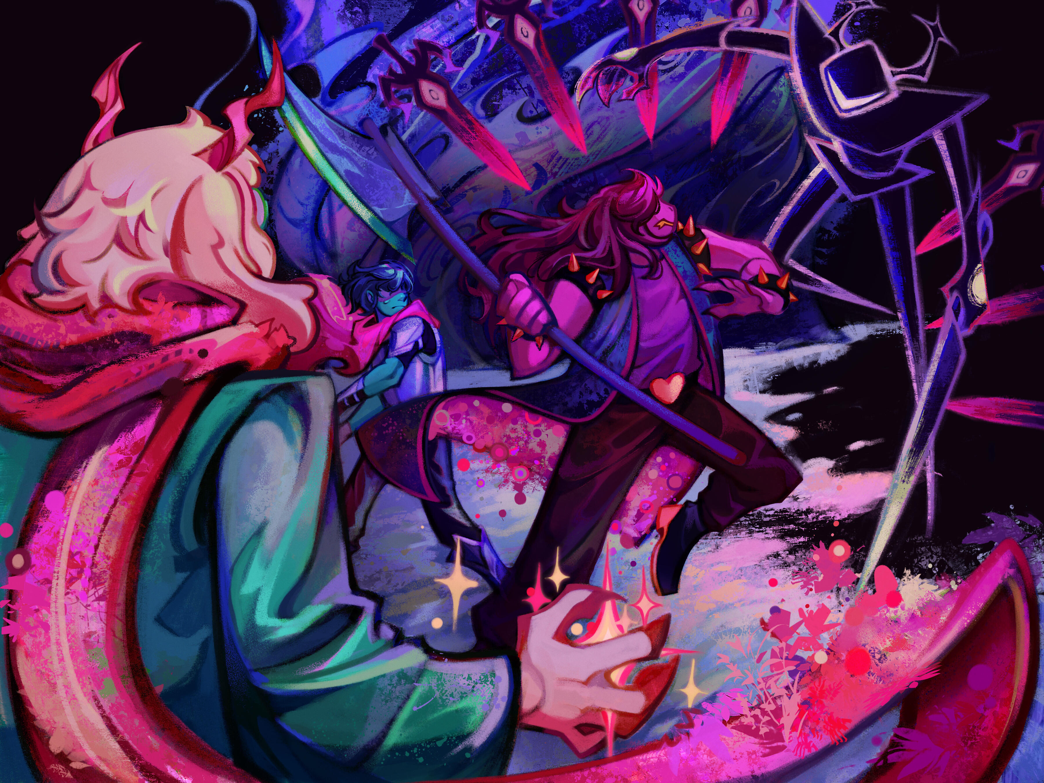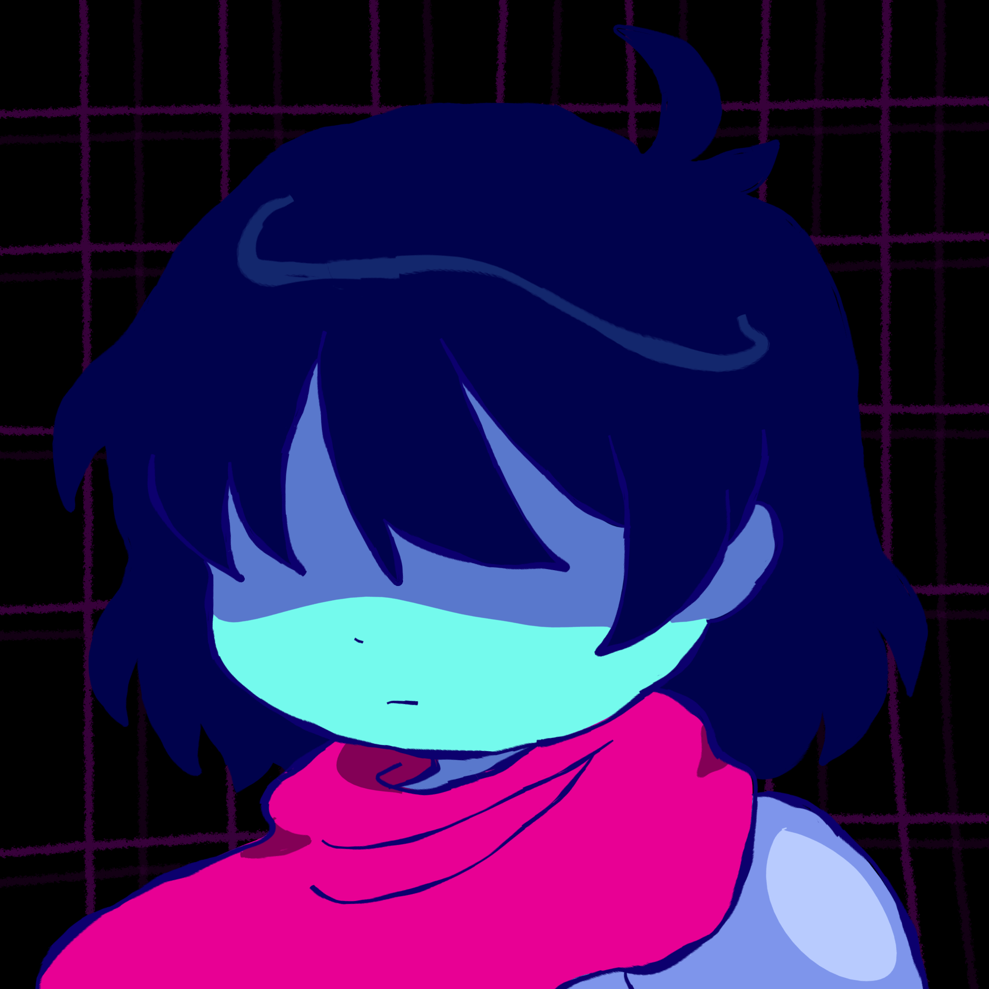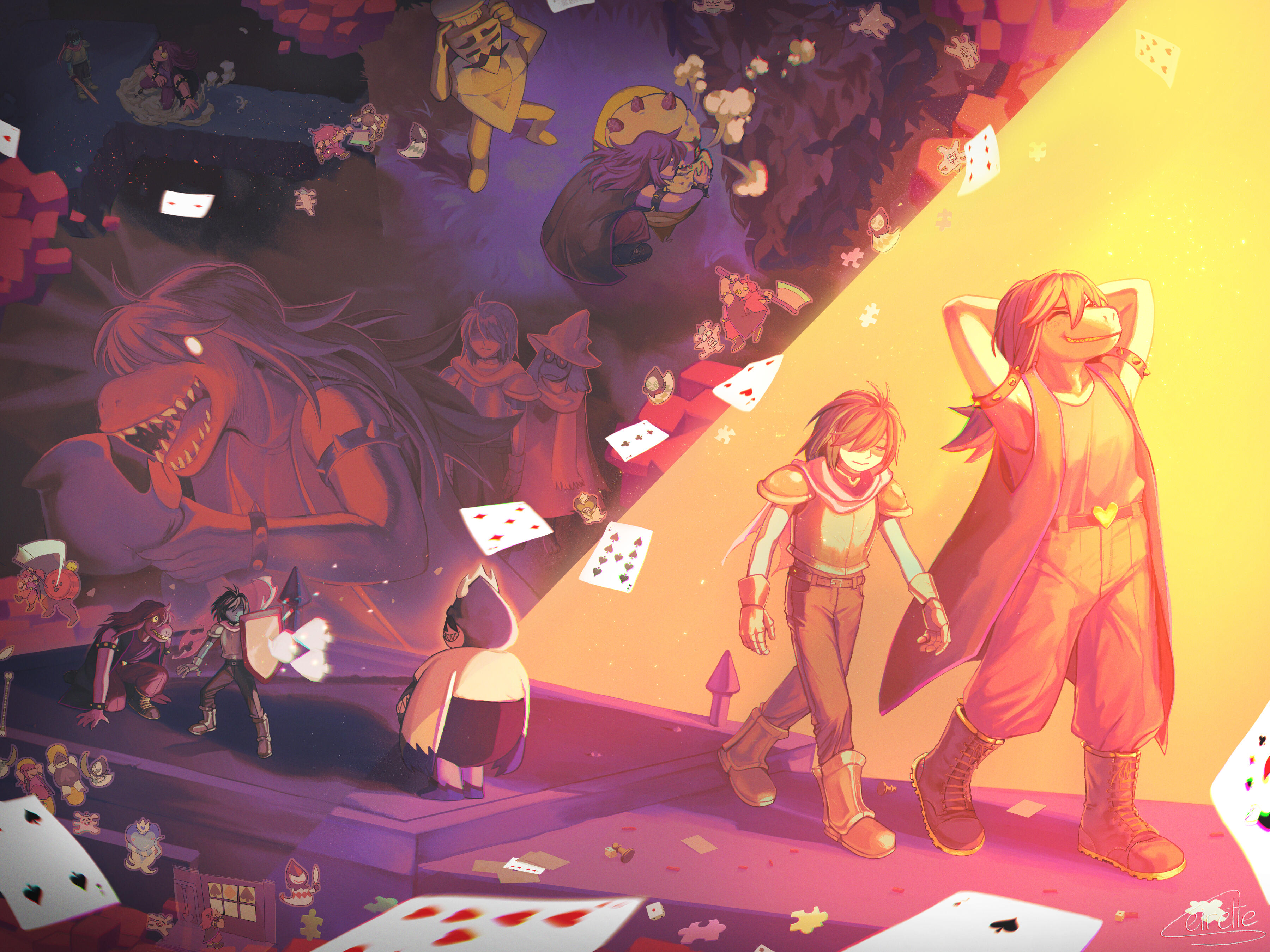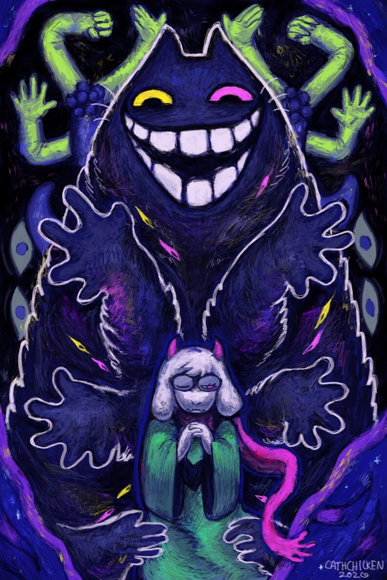 Kris.A part of her is freaked out by Kris, actually. The class weirdo that possibly outclasses her in abnormality, solely because she’s unable to decipher them. An individual that looks grown enough, but Toriel still insists on escorting personally to school every day. Forget what the classmates think of that. What does Kris think of that? Susie’s pissed that she can’t tell. She needs a reaction from the green sweatered fiend—which, by the way, washes Kris out with the muted greens and piss yellow. The color combination is truly abysmal, but Noelle said it was the same colors that Asriel dressed in, so maybe she should blame Toriel instead for the poor color coordination...They’re in the closet now. Right, Alphys wanted them to retrieve it together? Susie wants to crunch chalk to elicit a reaction from her silent companion. She opts for a quick verbal jab instead.“Now that we’re alone, wanna confess anything? Like how you might think green looks bad on you, and I dunno, maybe a color like purple would be better?”Nothing. Kris gives her a little glance, a reddish brown glint under their choppy bangs. She’ll take that as a win.Susie walks forward, Kris behind her——she falls. For a while. Way longer than she likes.When she stumbles up, she’s able to avoid the spikes on her wrists. She doesn’t remember wearing anything like that today. Susie turns to Kris to gauge their reaction, and instead she’s the one who blinks. Kris’s skin is a stark sky blue now, and their sweater is replaced with silvery armor.Susie chortles. “Seems like this world knows how to dress you better.”No response. She frowns. Kris gestures in a general direction, and Susie peers at the dark abyss. It seems like their only path now was forward, through the crusted muted purple ruins and creepy pockets that looked closer to bleeding eyes than tiny caves.Eventually, the place opens up a little into an area that feels more urban, sans the fact that there’s nobody in sight. Susie frowns for a moment, then switches it into a boisterous, roaring laugh. “We’re nervous for no reason, huh? This world’s emptier than Temmie’s brain.”Kris gives her a side look through their bangs, the first real modicum of emotion they’ve expressed probably ever today, and it’s one that Susie can kinda read as, are you serious? Or, you were nervous? Either way, it sort of pisses and delights Susie at the same time.There’s a shorter figure in front of them, framed by a lonely castle. Their face is obscured by a wide brimmed hat. They bluster underneath their pink scarf, not quite dissimilar to Kris’s cape. Something else ticks Susie, though. What is it...?Oh. They’re cloaked in green.Damn it.