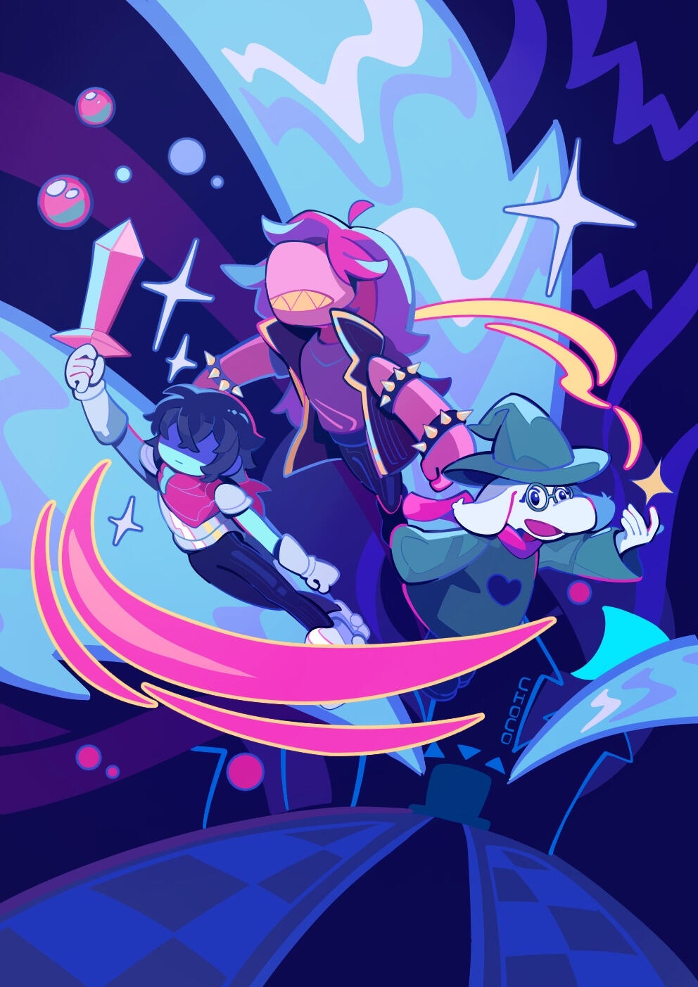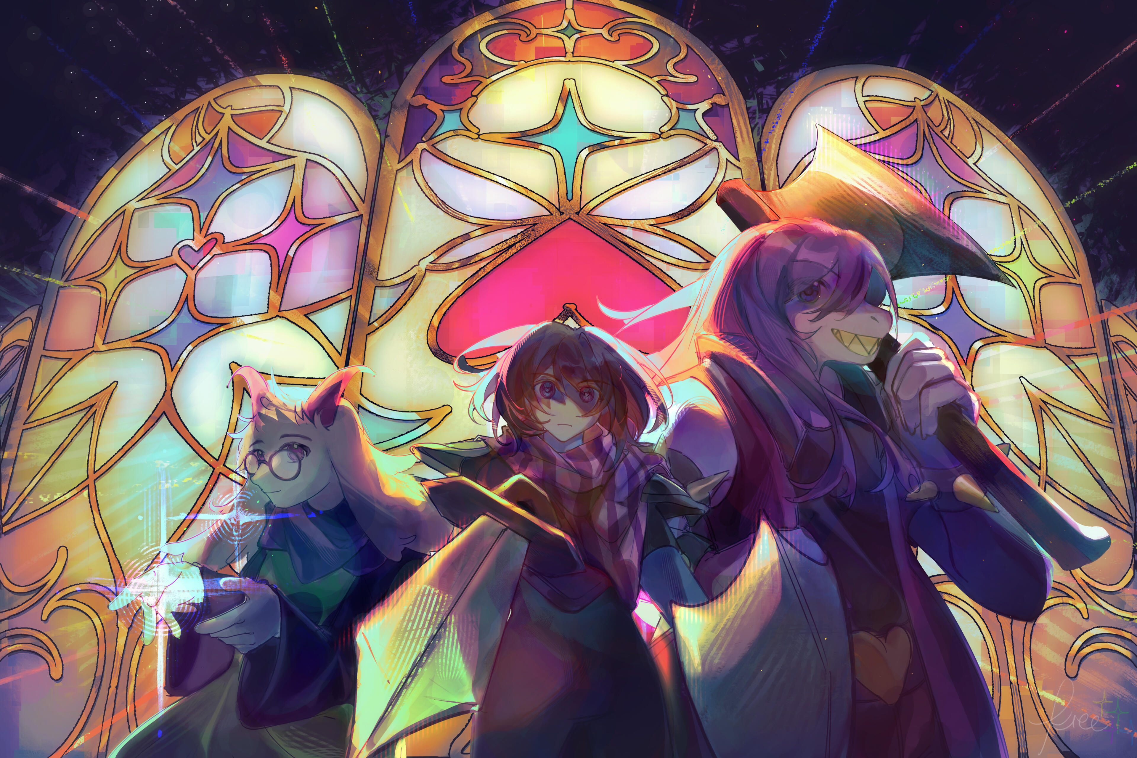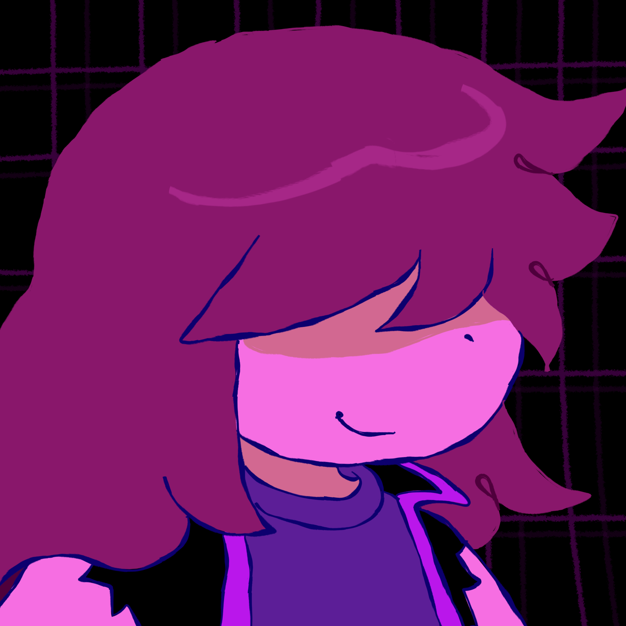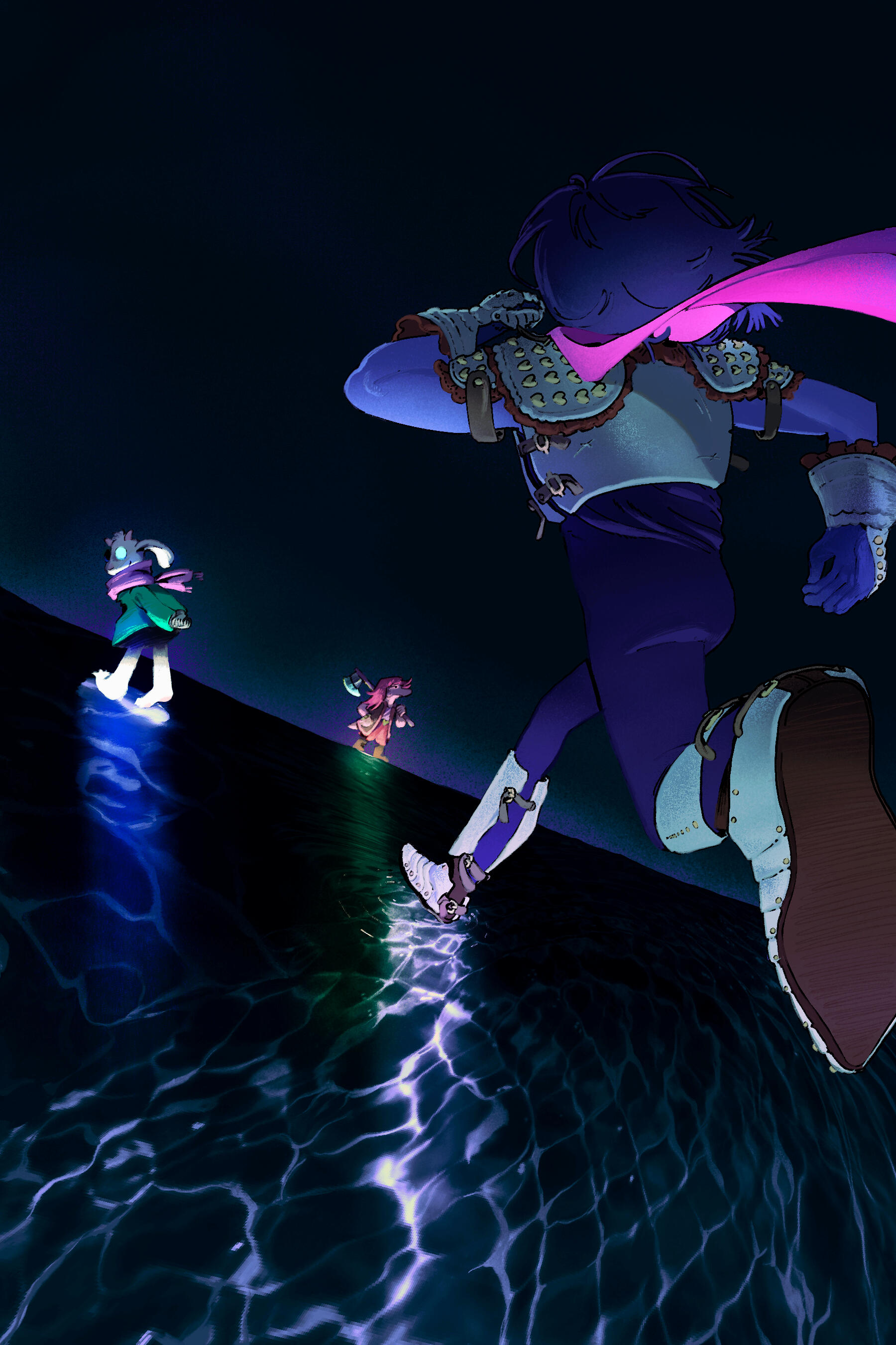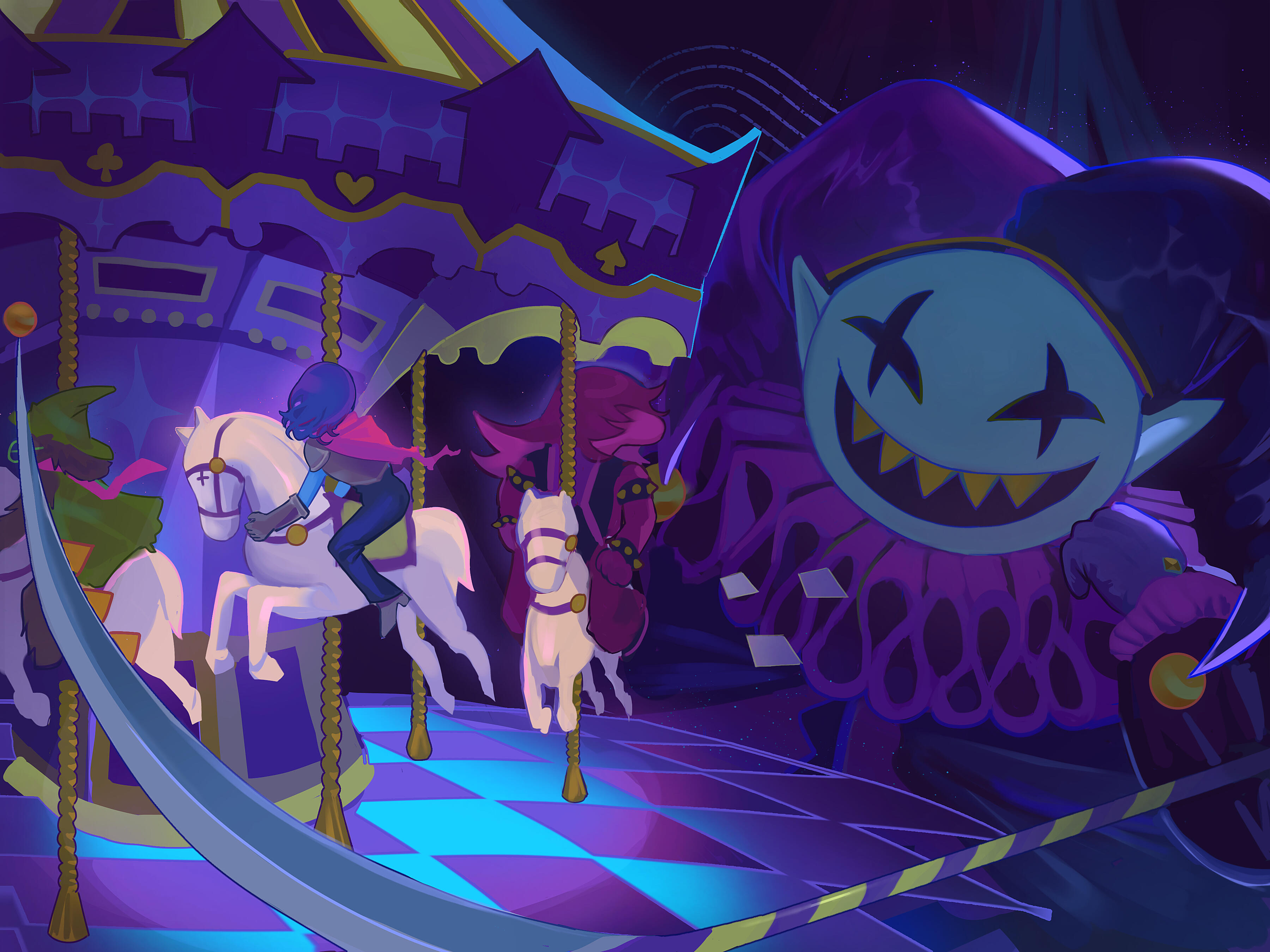 Kris.A part of her is freaked out by Kris, actually. The class weirdo that possibly outclasses her in abnormality, solely because she’s unable to decipher them. An individual that looks grown enough, but Toriel still insists on escorting personally to school every day. Forget what the classmates think of that. What does Kris think of that? Susie’s pissed that she can’t tell. She needs a reaction from the green sweatered fiend—which, by the way, washes Kris out with the muted greens and piss yellow. The color combination is truly abysmal, but Noelle said it was the same colors that Asriel dressed in, so maybe she should blame Toriel instead for the poor color coordination...They’re in the closet now. Right, Alphys wanted them to retrieve it together? Susie wants to crunch chalk to elicit a reaction from her silent companion. She opts for a quick verbal jab instead.“Now that we’re alone, wanna confess anything? Like how you might think green looks bad on you, and I dunno, maybe a color like purple would be better?”Nothing. Kris gives her a little glance, a reddish brown glint under their choppy bangs. She’ll take that as a win.Susie walks forward, Kris behind her——she falls. For a while. Way longer than she likes.When she stumbles up, she’s able to avoid the spikes on her wrists. She doesn’t remember wearing anything like that today. Susie turns to Kris to gauge their reaction, and instead she’s the one who blinks. Kris’s skin is a stark sky blue now, and their sweater is replaced with silvery armor.Susie chortles. “Seems like this world knows how to dress you better.”No response. She frowns. Kris gestures in a general direction, and Susie peers at the dark abyss. It seems like their only path now was forward, through the crusted muted purple ruins and creepy pockets that looked closer to bleeding eyes than tiny caves.Eventually, the place opens up a little into an area that feels more urban, sans the fact that there’s nobody in sight. Susie frowns for a moment, then switches it into a boisterous, roaring laugh. “We’re nervous for no reason, huh? This world’s emptier than Temmie’s brain.”Kris gives her a side look through their bangs, the first real modicum of emotion they’ve expressed probably ever today, and it’s one that Susie can kinda read as, are you serious? Or, you were nervous? Either way, it sort of pisses and delights Susie at the same time.There’s a shorter figure in front of them, framed by a lonely castle. Their face is obscured by a wide brimmed hat. They bluster underneath their pink scarf, not quite dissimilar to Kris’s cape. Something else ticks Susie, though. What is it...?Oh. They’re cloaked in green.Damn it.