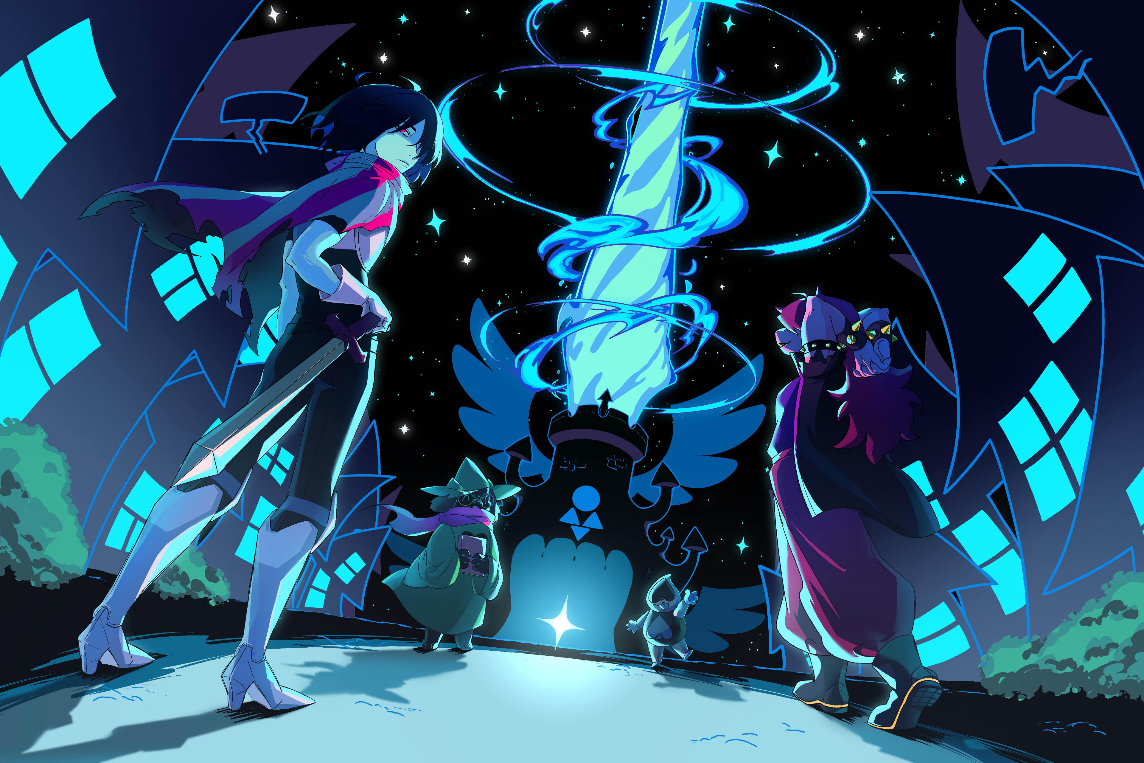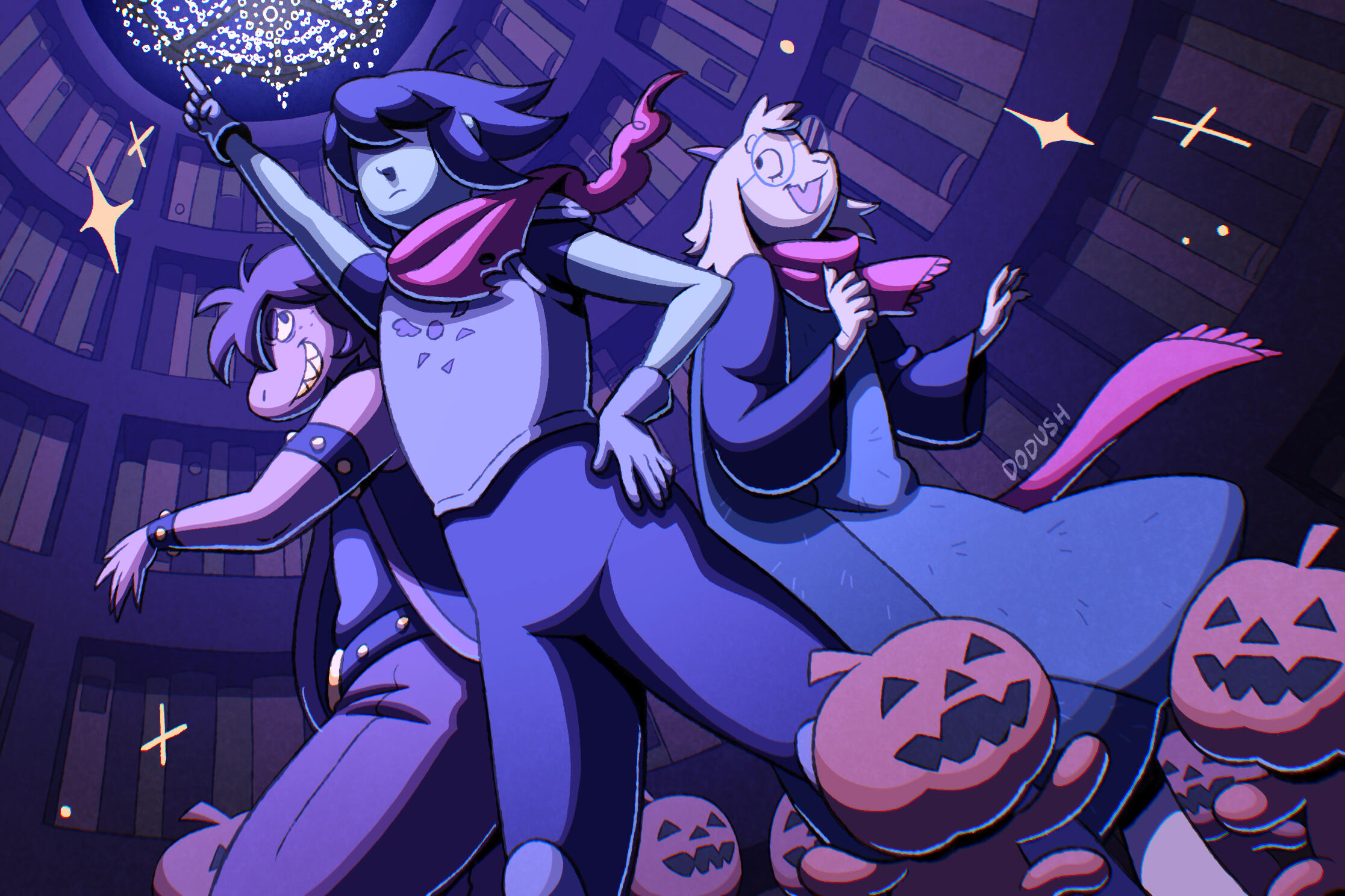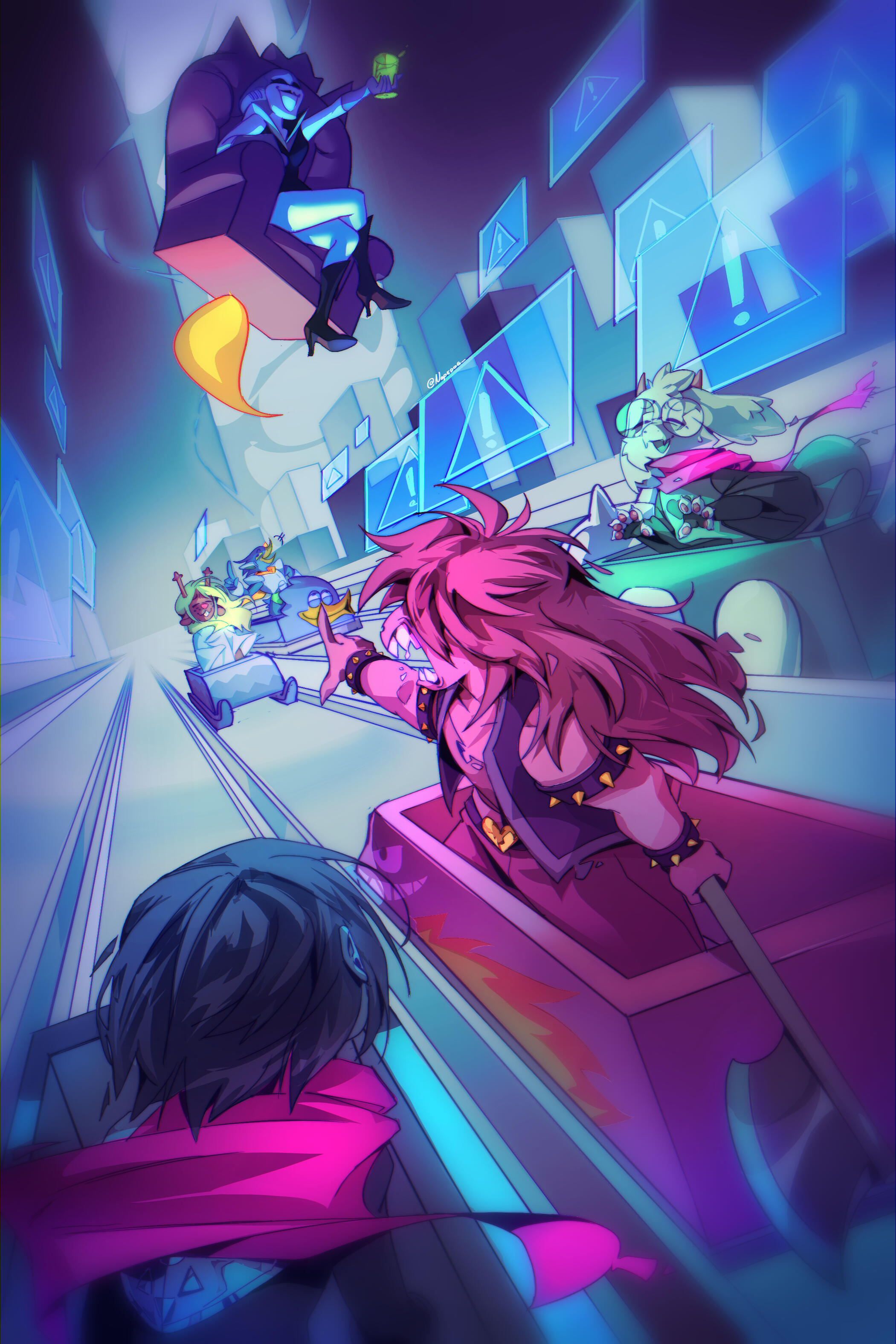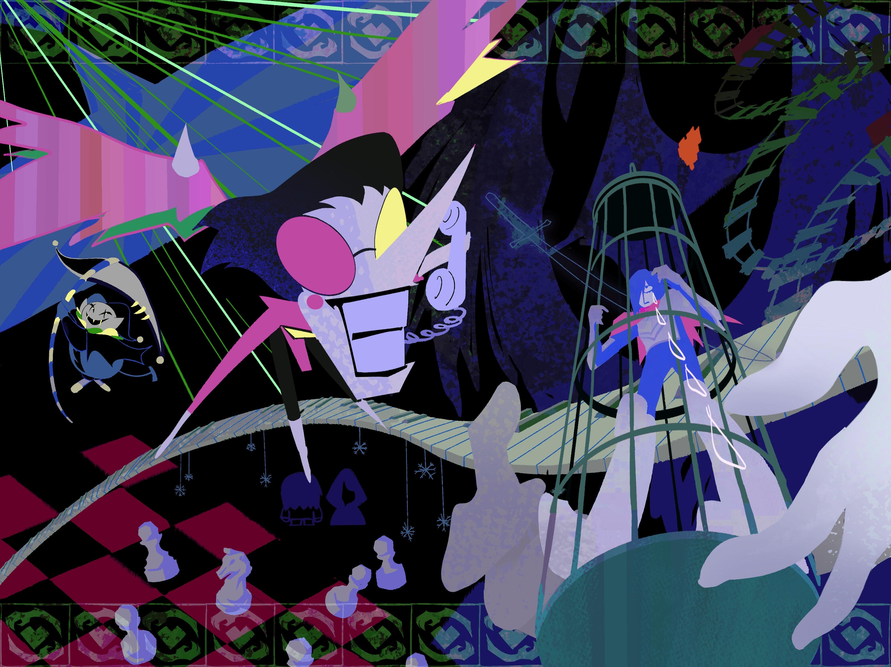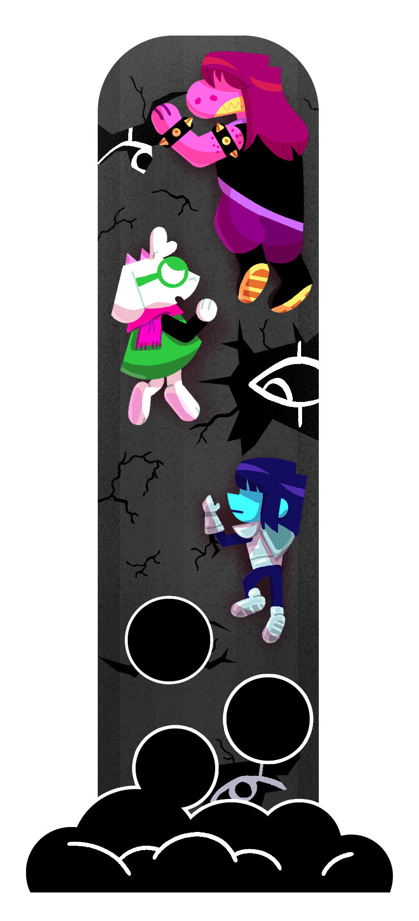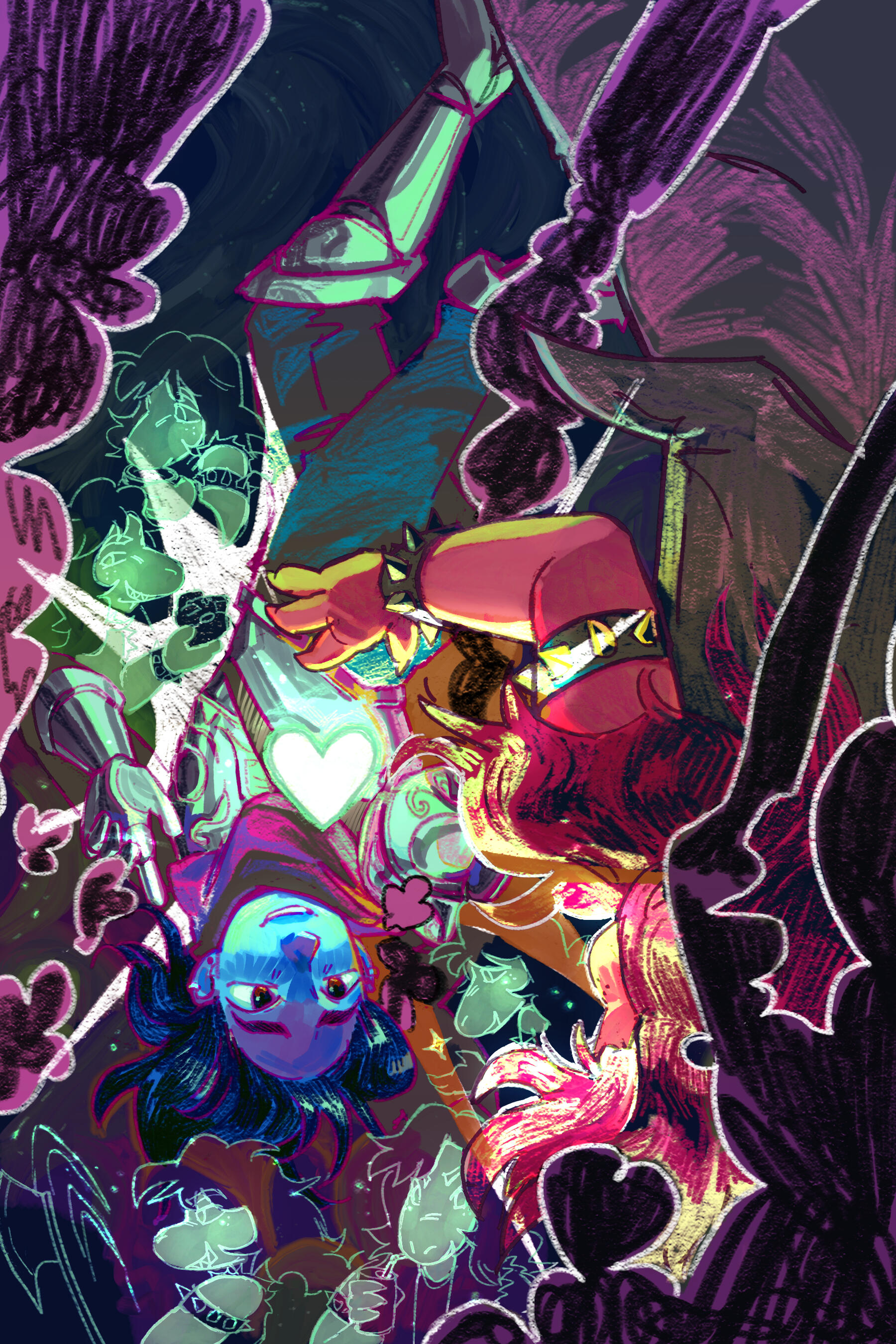 Kris.A part of her is freaked out by Kris, actually. The class weirdo that possibly outclasses her in abnormality, solely because she’s unable to decipher them. An individual that looks grown enough, but Toriel still insists on escorting personally to school every day. Forget what the classmates think of that. What does Kris think of that? Susie’s pissed that she can’t tell. She needs a reaction from the green sweatered fiend—which, by the way, washes Kris out with the muted greens and piss yellow. The color combination is truly abysmal, but Noelle said it was the same colors that Asriel dressed in, so maybe she should blame Toriel instead for the poor color coordination...They’re in the closet now. Right, Alphys wanted them to retrieve it together? Susie wants to crunch chalk to elicit a reaction from her silent companion. She opts for a quick verbal jab instead.“Now that we’re alone, wanna confess anything? Like how you might think green looks bad on you, and I dunno, maybe a color like purple would be better?”Nothing. Kris gives her a little glance, a reddish brown glint under their choppy bangs. She’ll take that as a win.Susie walks forward, Kris behind her——she falls. For a while. Way longer than she likes.When she stumbles up, she’s able to avoid the spikes on her wrists. She doesn’t remember wearing anything like that today. Susie turns to Kris to gauge their reaction, and instead she’s the one who blinks. Kris’s skin is a stark sky blue now, and their sweater is replaced with silvery armor.Susie chortles. “Seems like this world knows how to dress you better.”No response. She frowns. Kris gestures in a general direction, and Susie peers at the dark abyss. It seems like their only path now was forward, through the crusted muted purple ruins and creepy pockets that looked closer to bleeding eyes than tiny caves.Eventually, the place opens up a little into an area that feels more urban, sans the fact that there’s nobody in sight. Susie frowns for a moment, then switches it into a boisterous, roaring laugh. “We’re nervous for no reason, huh? This world’s emptier than Temmie’s brain.”Kris gives her a side look through their bangs, the first real modicum of emotion they’ve expressed probably ever today, and it’s one that Susie can kinda read as, are you serious? Or, you were nervous? Either way, it sort of pisses and delights Susie at the same time.There’s a shorter figure in front of them, framed by a lonely castle. Their face is obscured by a wide brimmed hat. They bluster underneath their pink scarf, not quite dissimilar to Kris’s cape. Something else ticks Susie, though. What is it...?Oh. They’re cloaked in green.Damn it.