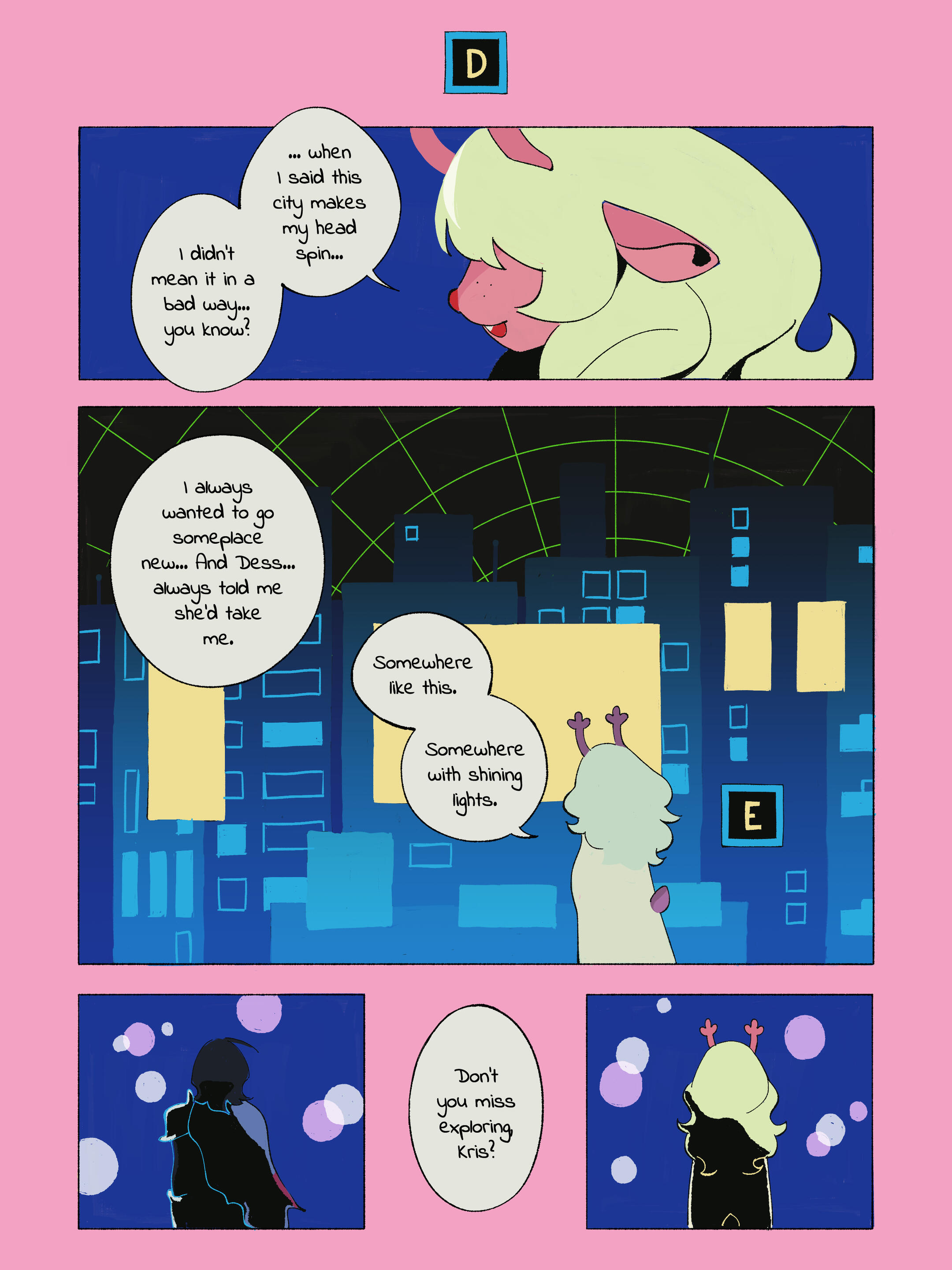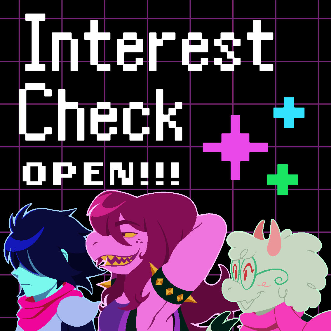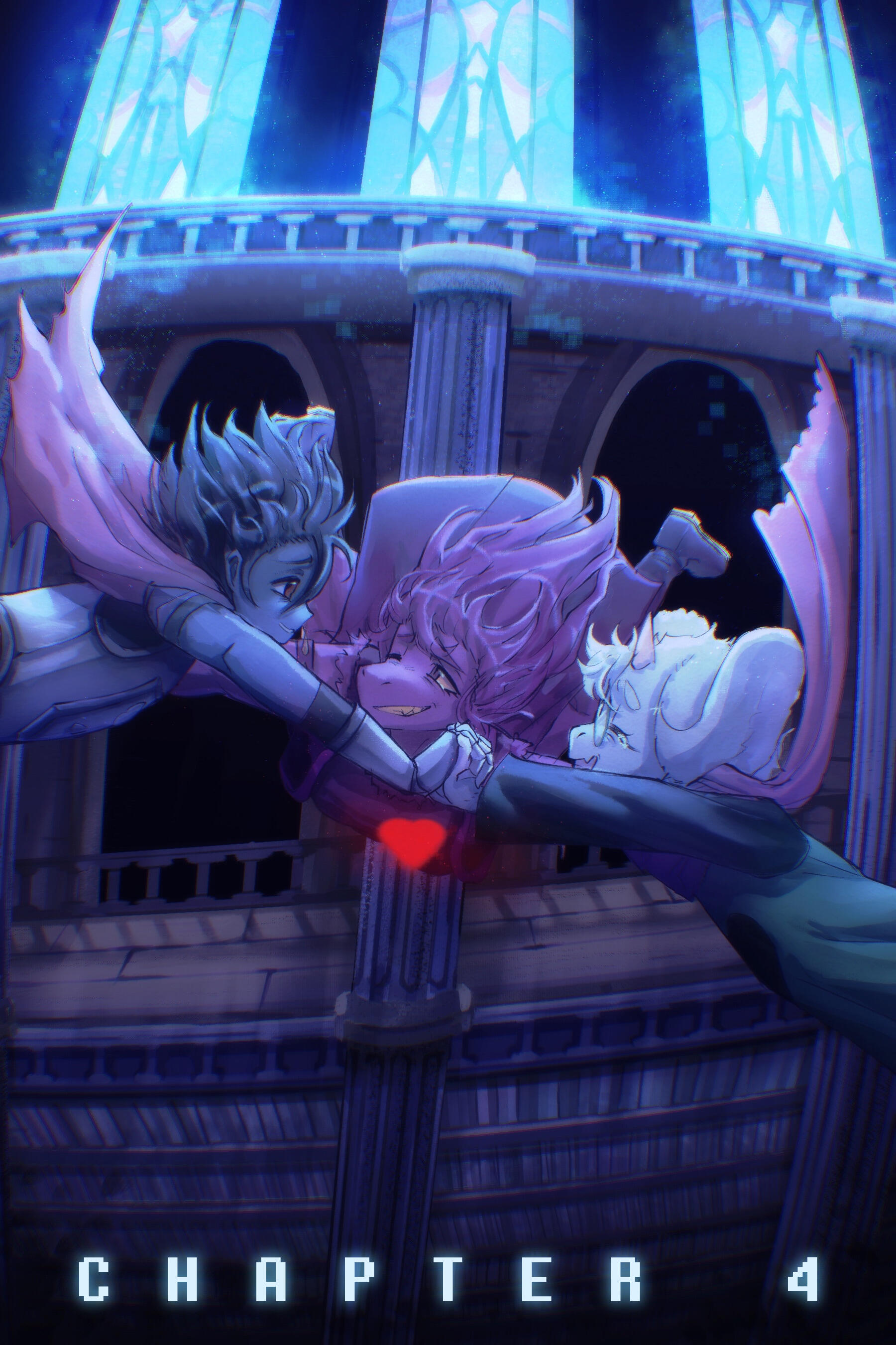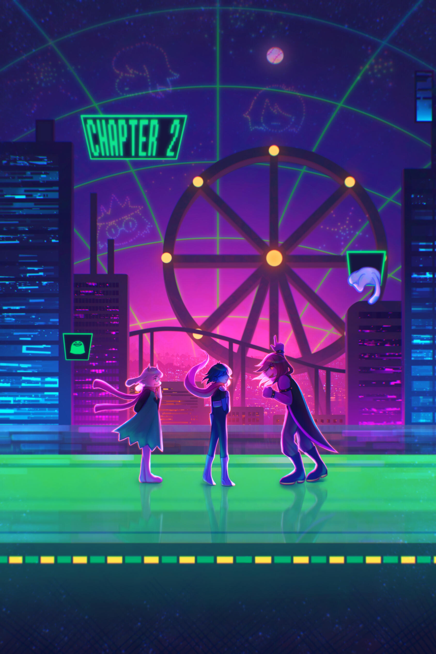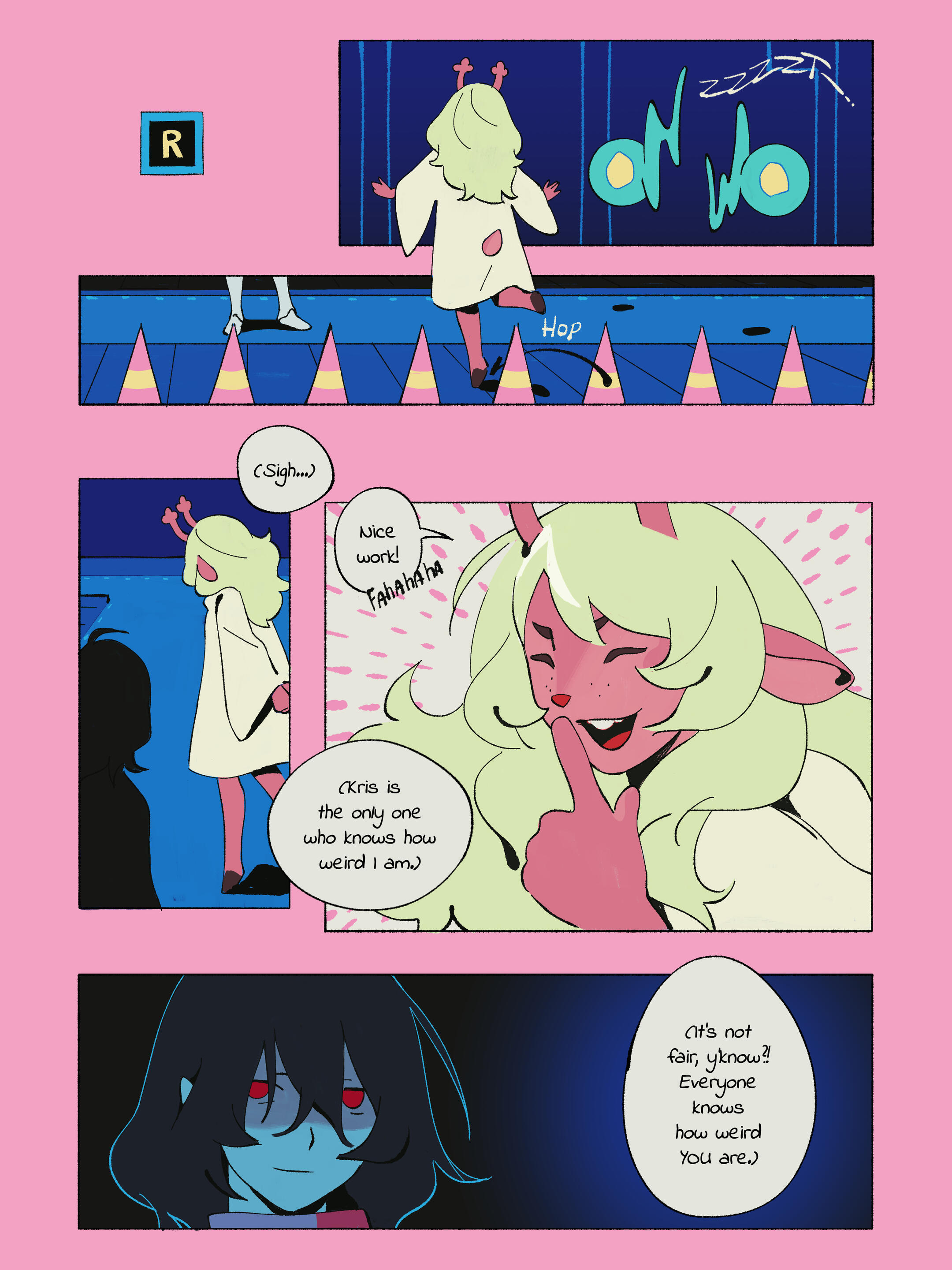 Kris.A part of her is freaked out by Kris, actually. The class weirdo that possibly outclasses her in abnormality, solely because she’s unable to decipher them. An individual that looks grown enough, but Toriel still insists on escorting personally to school every day. Forget what the classmates think of that. What does Kris think of that? Susie’s pissed that she can’t tell. She needs a reaction from the green sweatered fiend—which, by the way, washes Kris out with the muted greens and piss yellow. The color combination is truly abysmal, but Noelle said it was the same colors that Asriel dressed in, so maybe she should blame Toriel instead for the poor color coordination...They’re in the closet now. Right, Alphys wanted them to retrieve it together? Susie wants to crunch chalk to elicit a reaction from her silent companion. She opts for a quick verbal jab instead.“Now that we’re alone, wanna confess anything? Like how you might think green looks bad on you, and I dunno, maybe a color like purple would be better?”Nothing. Kris gives her a little glance, a reddish brown glint under their choppy bangs. She’ll take that as a win.Susie walks forward, Kris behind her——she falls. For a while. Way longer than she likes.When she stumbles up, she’s able to avoid the spikes on her wrists. She doesn’t remember wearing anything like that today. Susie turns to Kris to gauge their reaction, and instead she’s the one who blinks. Kris’s skin is a stark sky blue now, and their sweater is replaced with silvery armor.Susie chortles. “Seems like this world knows how to dress you better.”No response. She frowns. Kris gestures in a general direction, and Susie peers at the dark abyss. It seems like their only path now was forward, through the crusted muted purple ruins and creepy pockets that looked closer to bleeding eyes than tiny caves.Eventually, the place opens up a little into an area that feels more urban, sans the fact that there’s nobody in sight. Susie frowns for a moment, then switches it into a boisterous, roaring laugh. “We’re nervous for no reason, huh? This world’s emptier than Temmie’s brain.”Kris gives her a side look through their bangs, the first real modicum of emotion they’ve expressed probably ever today, and it’s one that Susie can kinda read as, are you serious? Or, you were nervous? Either way, it sort of pisses and delights Susie at the same time.There’s a shorter figure in front of them, framed by a lonely castle. Their face is obscured by a wide brimmed hat. They bluster underneath their pink scarf, not quite dissimilar to Kris’s cape. Something else ticks Susie, though. What is it...?Oh. They’re cloaked in green.Damn it.
