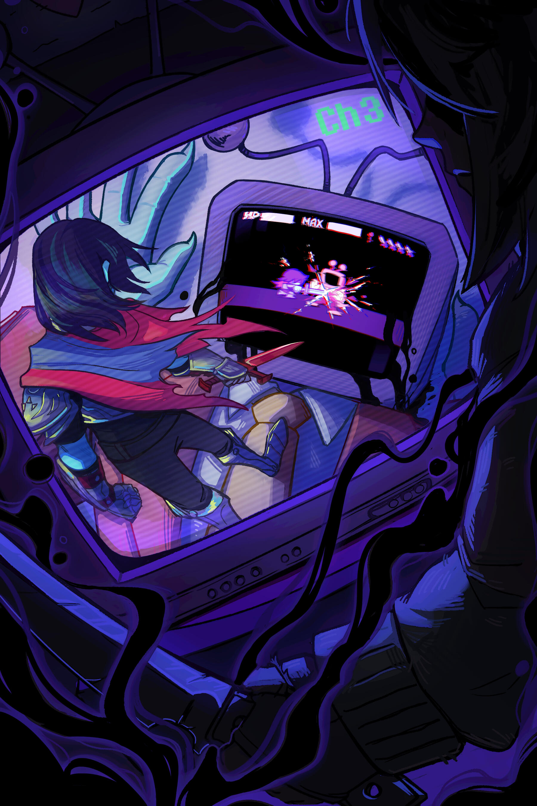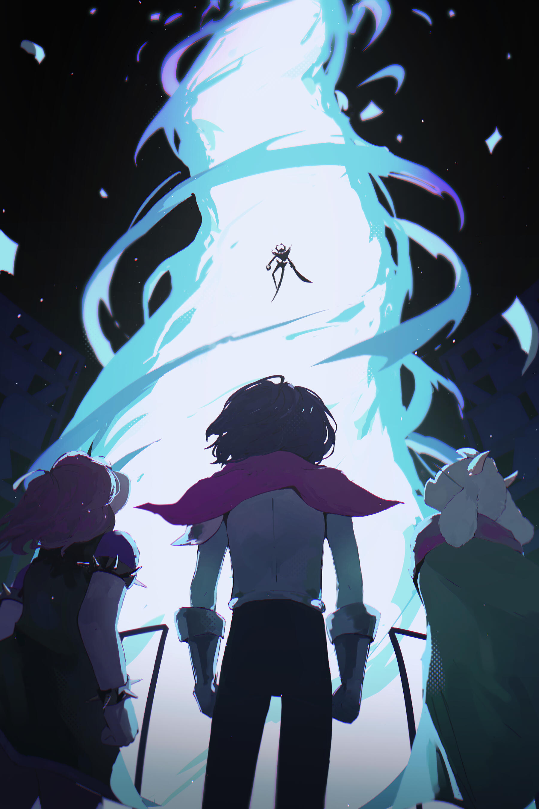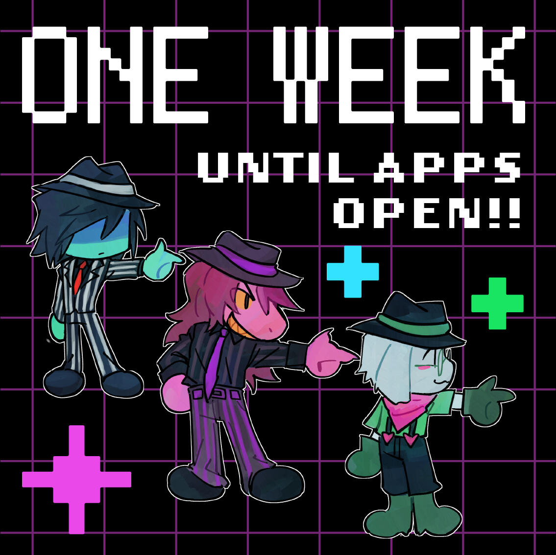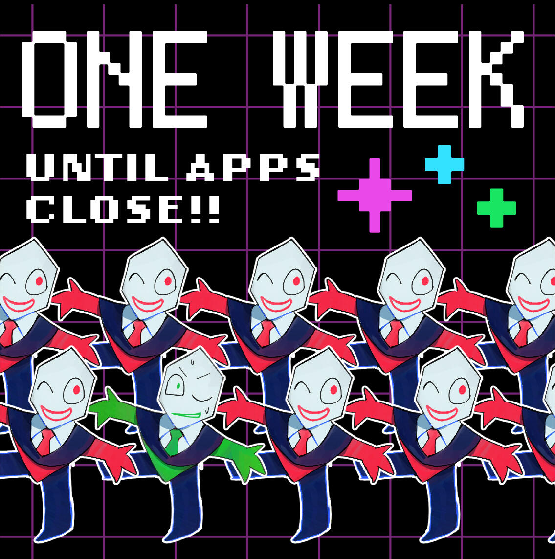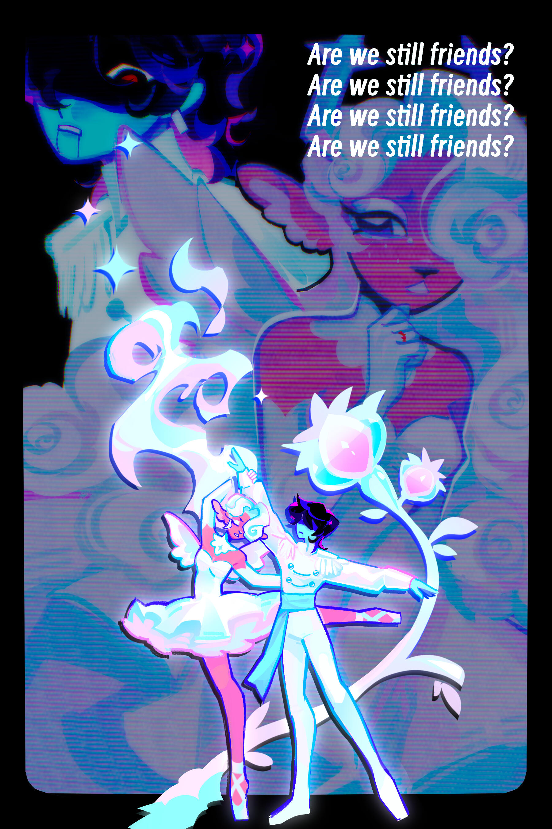 Kris.A part of her is freaked out by Kris, actually. The class weirdo that possibly outclasses her in abnormality, solely because she’s unable to decipher them. An individual that looks grown enough, but Toriel still insists on escorting personally to school every day. Forget what the classmates think of that. What does Kris think of that? Susie’s pissed that she can’t tell. She needs a reaction from the green sweatered fiend—which, by the way, washes Kris out with the muted greens and piss yellow. The color combination is truly abysmal, but Noelle said it was the same colors that Asriel dressed in, so maybe she should blame Toriel instead for the poor color coordination...They’re in the closet now. Right, Alphys wanted them to retrieve it together? Susie wants to crunch chalk to elicit a reaction from her silent companion. She opts for a quick verbal jab instead.“Now that we’re alone, wanna confess anything? Like how you might think green looks bad on you, and I dunno, maybe a color like purple would be better?”Nothing. Kris gives her a little glance, a reddish brown glint under their choppy bangs. She’ll take that as a win.Susie walks forward, Kris behind her——she falls. For a while. Way longer than she likes.When she stumbles up, she’s able to avoid the spikes on her wrists. She doesn’t remember wearing anything like that today. Susie turns to Kris to gauge their reaction, and instead she’s the one who blinks. Kris’s skin is a stark sky blue now, and their sweater is replaced with silvery armor.Susie chortles. “Seems like this world knows how to dress you better.”No response. She frowns. Kris gestures in a general direction, and Susie peers at the dark abyss. It seems like their only path now was forward, through the crusted muted purple ruins and creepy pockets that looked closer to bleeding eyes than tiny caves.Eventually, the place opens up a little into an area that feels more urban, sans the fact that there’s nobody in sight. Susie frowns for a moment, then switches it into a boisterous, roaring laugh. “We’re nervous for no reason, huh? This world’s emptier than Temmie’s brain.”Kris gives her a side look through their bangs, the first real modicum of emotion they’ve expressed probably ever today, and it’s one that Susie can kinda read as, are you serious? Or, you were nervous? Either way, it sort of pisses and delights Susie at the same time.There’s a shorter figure in front of them, framed by a lonely castle. Their face is obscured by a wide brimmed hat. They bluster underneath their pink scarf, not quite dissimilar to Kris’s cape. Something else ticks Susie, though. What is it...?Oh. They’re cloaked in green.Damn it.