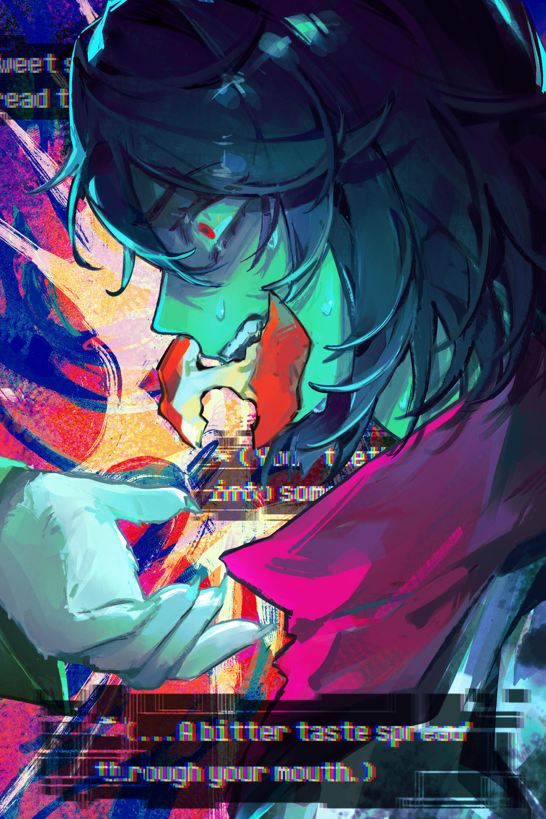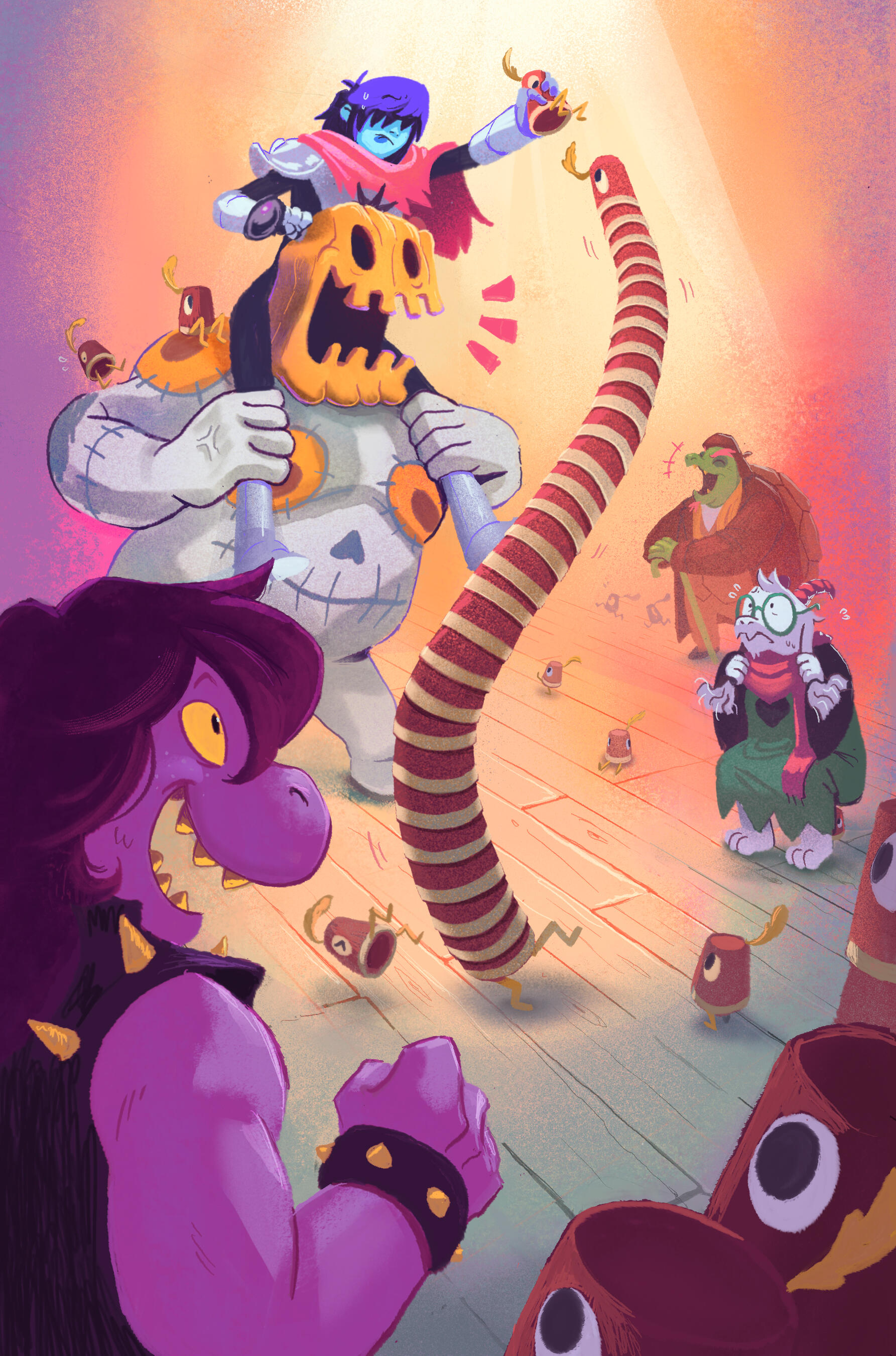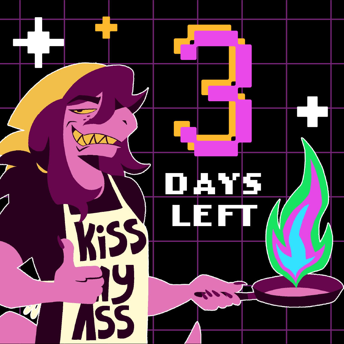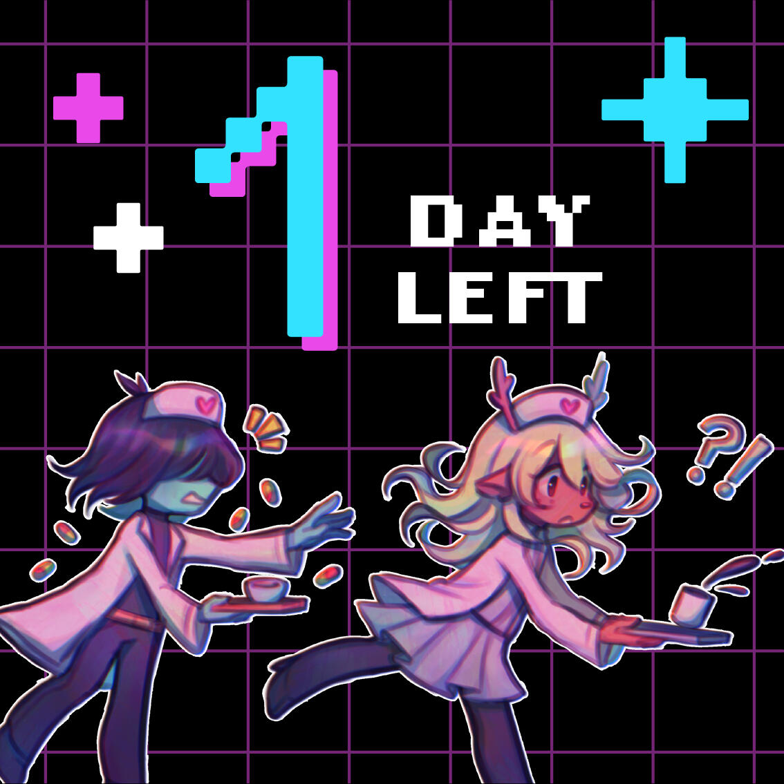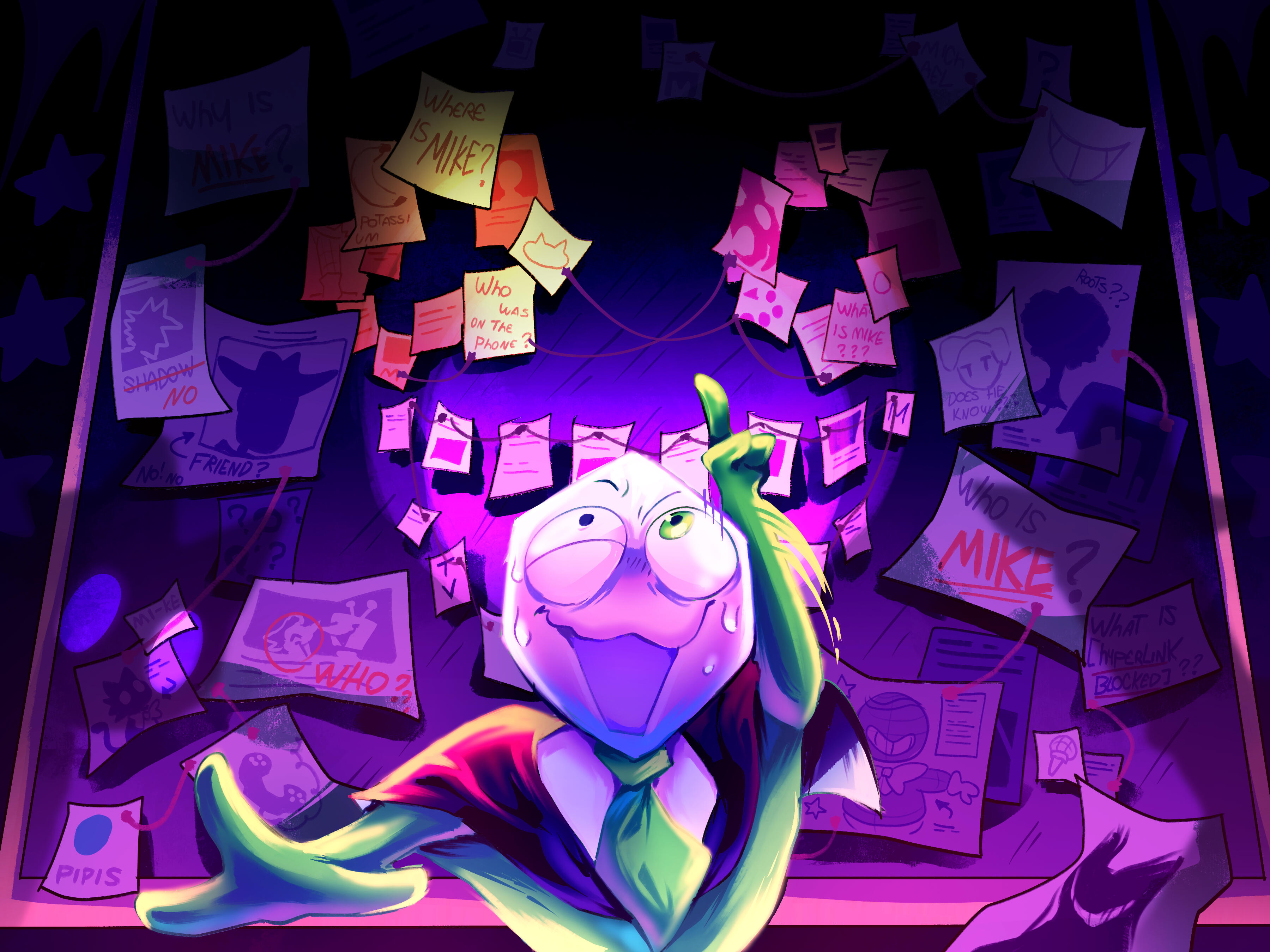 Kris.A part of her is freaked out by Kris, actually. The class weirdo that possibly outclasses her in abnormality, solely because she’s unable to decipher them. An individual that looks grown enough, but Toriel still insists on escorting personally to school every day. Forget what the classmates think of that. What does Kris think of that? Susie’s pissed that she can’t tell. She needs a reaction from the green sweatered fiend—which, by the way, washes Kris out with the muted greens and piss yellow. The color combination is truly abysmal, but Noelle said it was the same colors that Asriel dressed in, so maybe she should blame Toriel instead for the poor color coordination...They’re in the closet now. Right, Alphys wanted them to retrieve it together? Susie wants to crunch chalk to elicit a reaction from her silent companion. She opts for a quick verbal jab instead.“Now that we’re alone, wanna confess anything? Like how you might think green looks bad on you, and I dunno, maybe a color like purple would be better?”Nothing. Kris gives her a little glance, a reddish brown glint under their choppy bangs. She’ll take that as a win.Susie walks forward, Kris behind her——she falls. For a while. Way longer than she likes.When she stumbles up, she’s able to avoid the spikes on her wrists. She doesn’t remember wearing anything like that today. Susie turns to Kris to gauge their reaction, and instead she’s the one who blinks. Kris’s skin is a stark sky blue now, and their sweater is replaced with silvery armor.Susie chortles. “Seems like this world knows how to dress you better.”No response. She frowns. Kris gestures in a general direction, and Susie peers at the dark abyss. It seems like their only path now was forward, through the crusted muted purple ruins and creepy pockets that looked closer to bleeding eyes than tiny caves.Eventually, the place opens up a little into an area that feels more urban, sans the fact that there’s nobody in sight. Susie frowns for a moment, then switches it into a boisterous, roaring laugh. “We’re nervous for no reason, huh? This world’s emptier than Temmie’s brain.”Kris gives her a side look through their bangs, the first real modicum of emotion they’ve expressed probably ever today, and it’s one that Susie can kinda read as, are you serious? Or, you were nervous? Either way, it sort of pisses and delights Susie at the same time.There’s a shorter figure in front of them, framed by a lonely castle. Their face is obscured by a wide brimmed hat. They bluster underneath their pink scarf, not quite dissimilar to Kris’s cape. Something else ticks Susie, though. What is it...?Oh. They’re cloaked in green.Damn it.