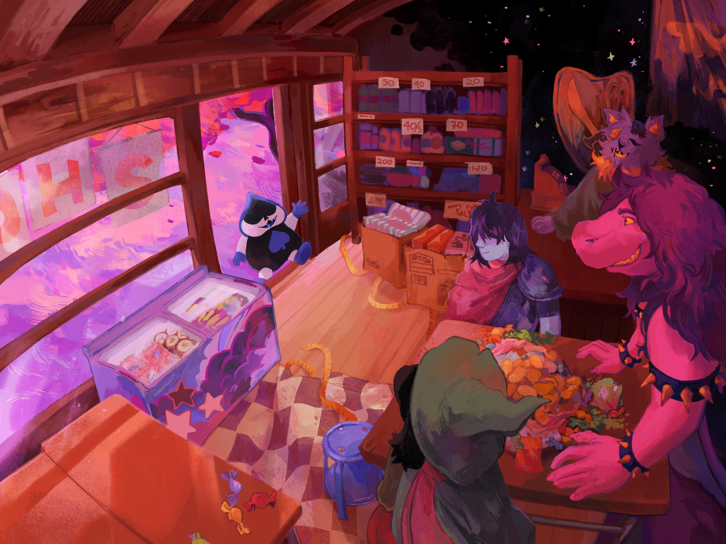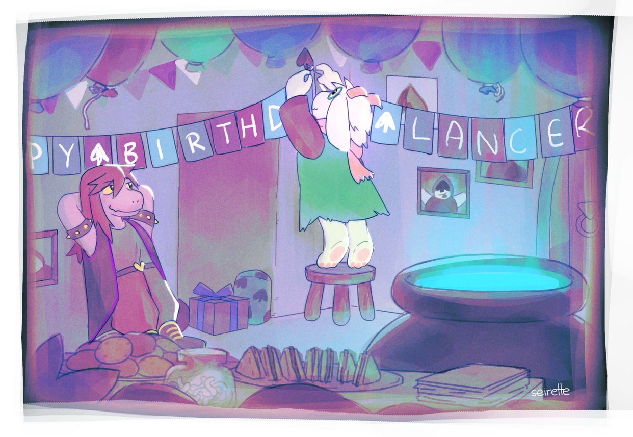 “Rals,” said Susie. “Are you trying to dig Lancer a new hole for his birthday? 'Cause you're doing a great job so far.”“Do you think he'll like the streamers?” asked Ralsei. He did not stop pacing, though he did lighten his steps a tad just in case he truly was wearing a path into the ground. Better safe than sorry. “I made sure to get them in the colors he likes, but I’m not sure if I should have printed the text for the banners instead of writing it myself...”“Ralsei,” Susie said. She snuck a cookie off the platter on the buffet table. (Ralsei had more pressing concerns and so did not scold her, settling for a dry look. She grinned back, unrepentant.) “It'll be fine. Lancer's gonna love it! You'll see. He’s gonna be all over the place.”