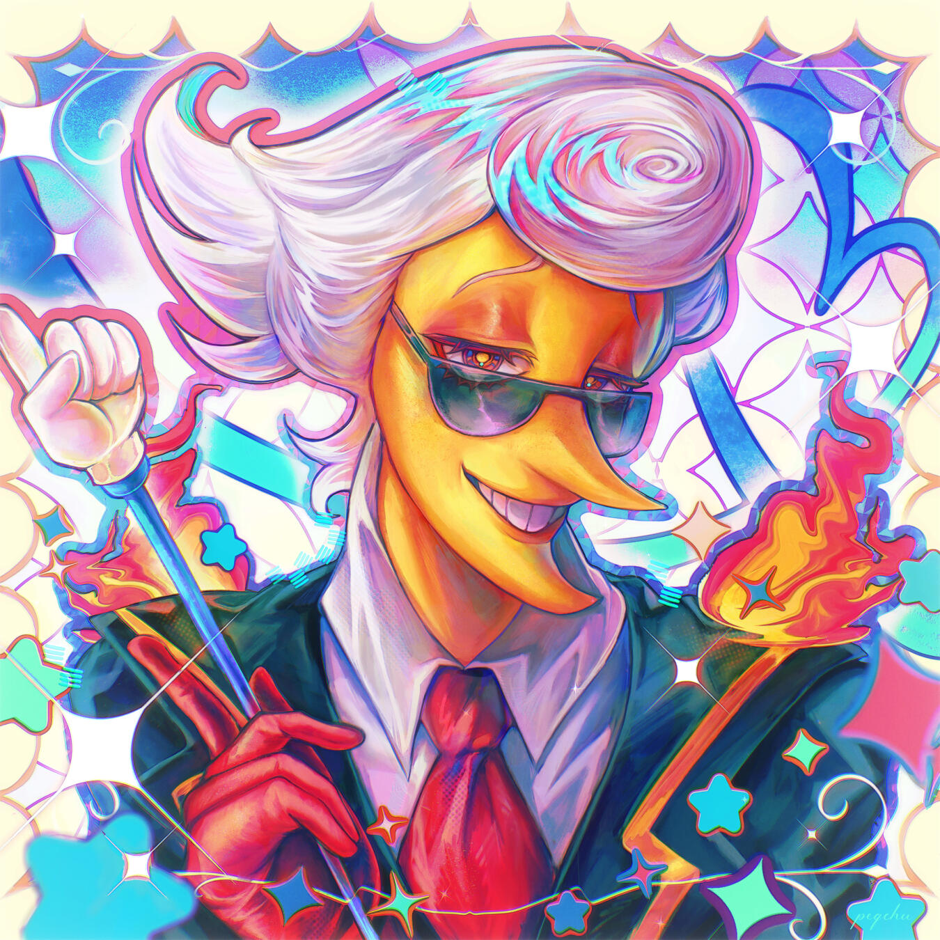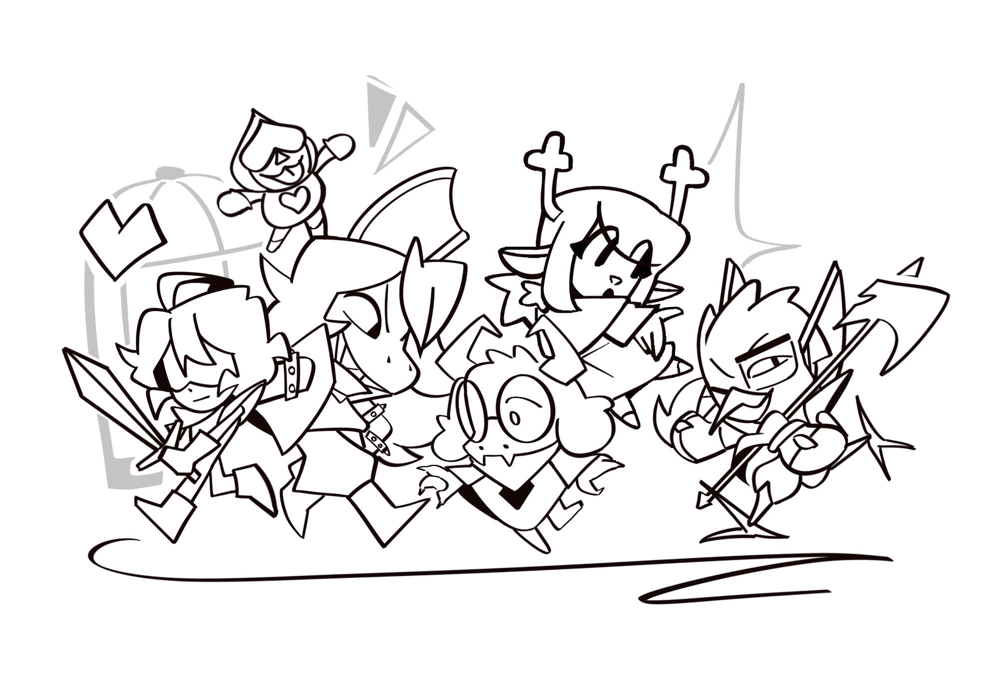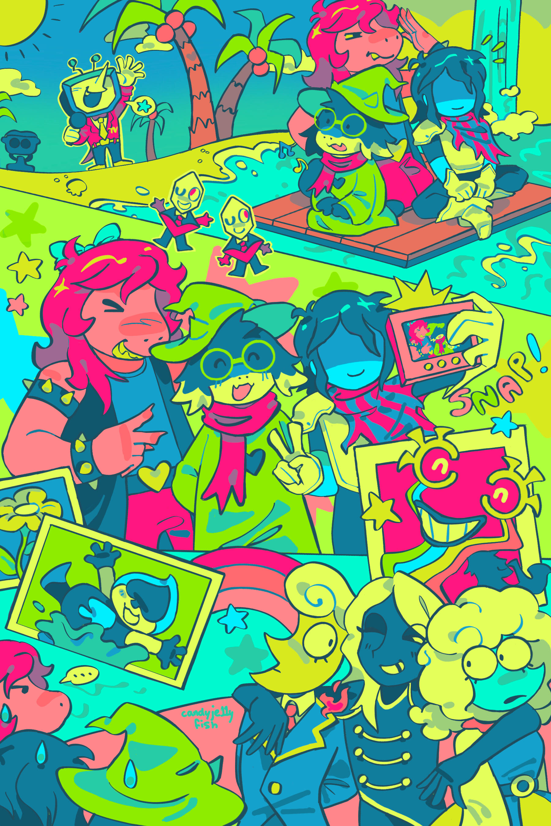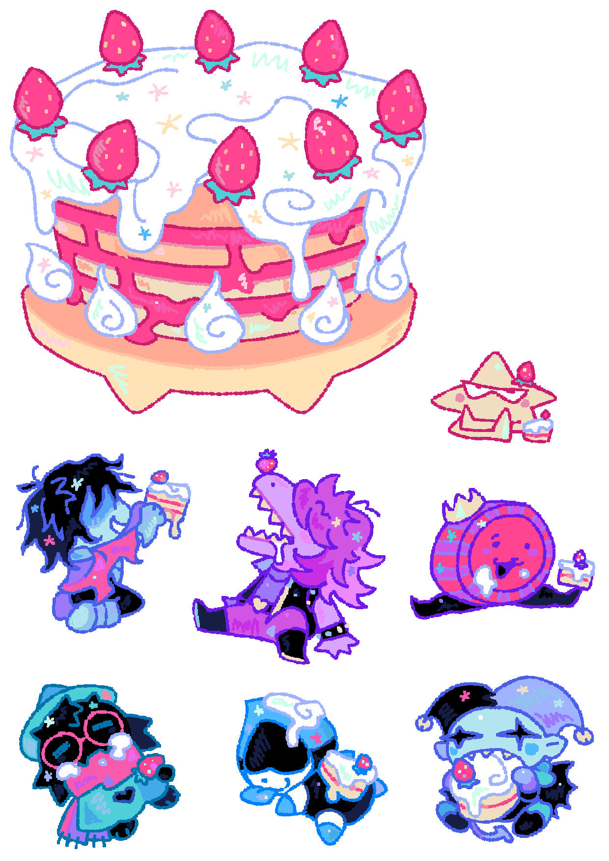 “So,” said Ralsei, once the chaos had died down. “You found out we were having a birthday party, and decided to crash it?”“What?” asked Lancer. “No! I’m bringing your party to you!”“...You’re doing...my party...?” He’d caught wind of Ralsei trying to plan his party? How?“Yessaroo, buckaroo!” Lancer beamed, standing proud with his hands on his hips.The band started up again: HAPPY BIIIRTHDAY TO YOUUU!Then he looked around. “Hold the tones!” He cried, and held his hand up. His mariachi band silenced at once.He pointed at the banners, the buffet table. Ralsei’s modest cake, decorated to look like Card Castle with help from Top Chef and Swatch. “You’re hosting your OWN birthday party?! Without ME?!”What? “No, this is your party,” Ralsei said. Helpless but to parrot Lancer in the wake of his confusion, he asked, “You’re throwing your own birthday?”“No, I told you! This is your party! Keep up!” He snapped his fingers and a Rudinn appeared next to him, unfurling a large banner with Ralsei’s face on it. BIRTHDAY BOY, it declared. It looked, distressingly, like a wanted poster. Lancer waved at it. “See?”“I can’t believe this,” said Susie, still snickering. “You two dumbasses really had no clue this was happening? You nearly bumped into each other a gazillion fuh—reaking times getting the cake!”“I expect-a some recognition for my hard work,” sniffed Top Chef, from behind the towering spectacle that was the cake Lancer had brought in. There were sparklers on each glittering tier. “Rush orders are-a difficult as it is, let alone two at once!”“I had no clue,” said Ralsei. Then, turning to Susie accusingly: “You knew?”“Uh, duh!” She snorted. “Just about everyone in town knew! Neither of you were sneaky about it.”“I think I was plenty sneaky,” said Lancer. Kris, who was eyeing the plate of choco diamonds covetously, coughed into their fist and muttered something. He said, “Well, of course I needed to practice!”“All right, all right, wrap it up,” said Susie. She clapped her hands and rubbed them together. Grinning, gaze trained on the cake, she said, “Let’s get this party started! Hit it, DJ!”“Sure thing!” chirped K_K, and chucked a CD straight at Lancer, who caught it in his mouth.He chewed. “Mm, cream cheese! You really went all out with the catering!”