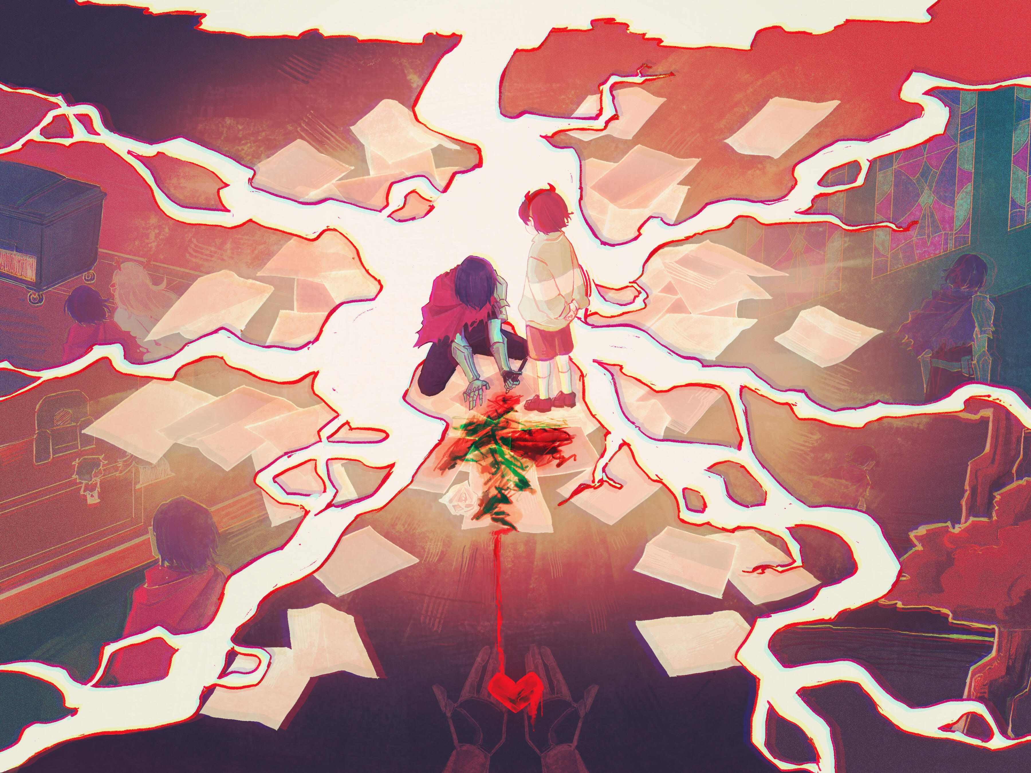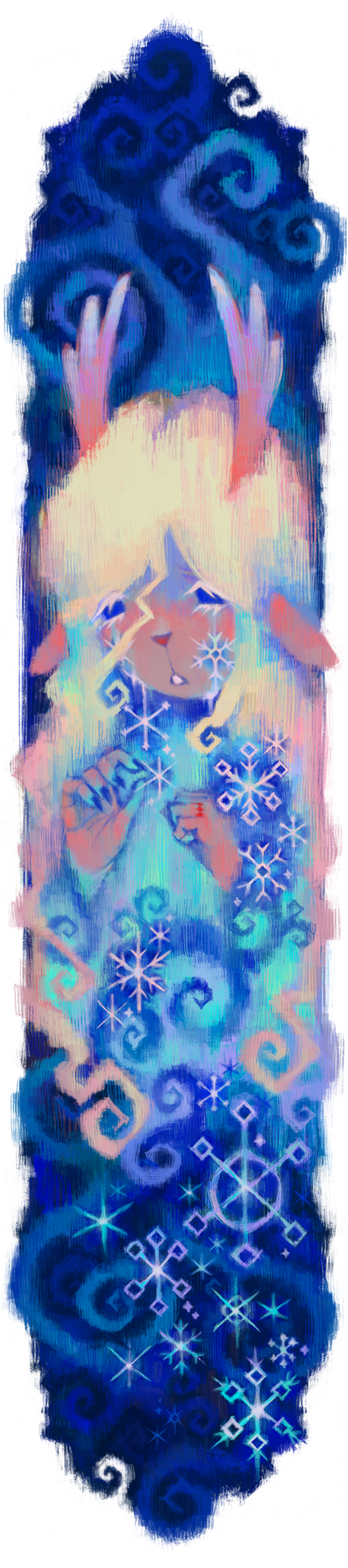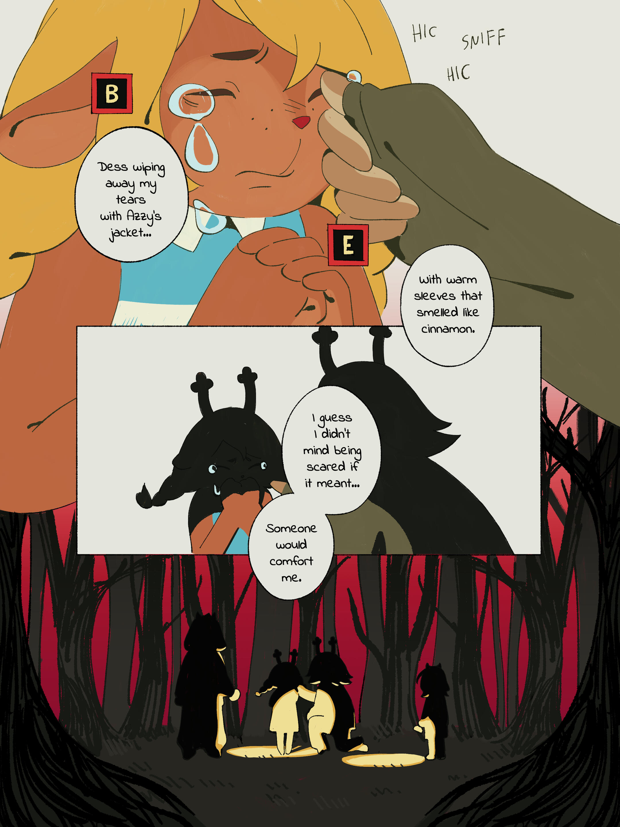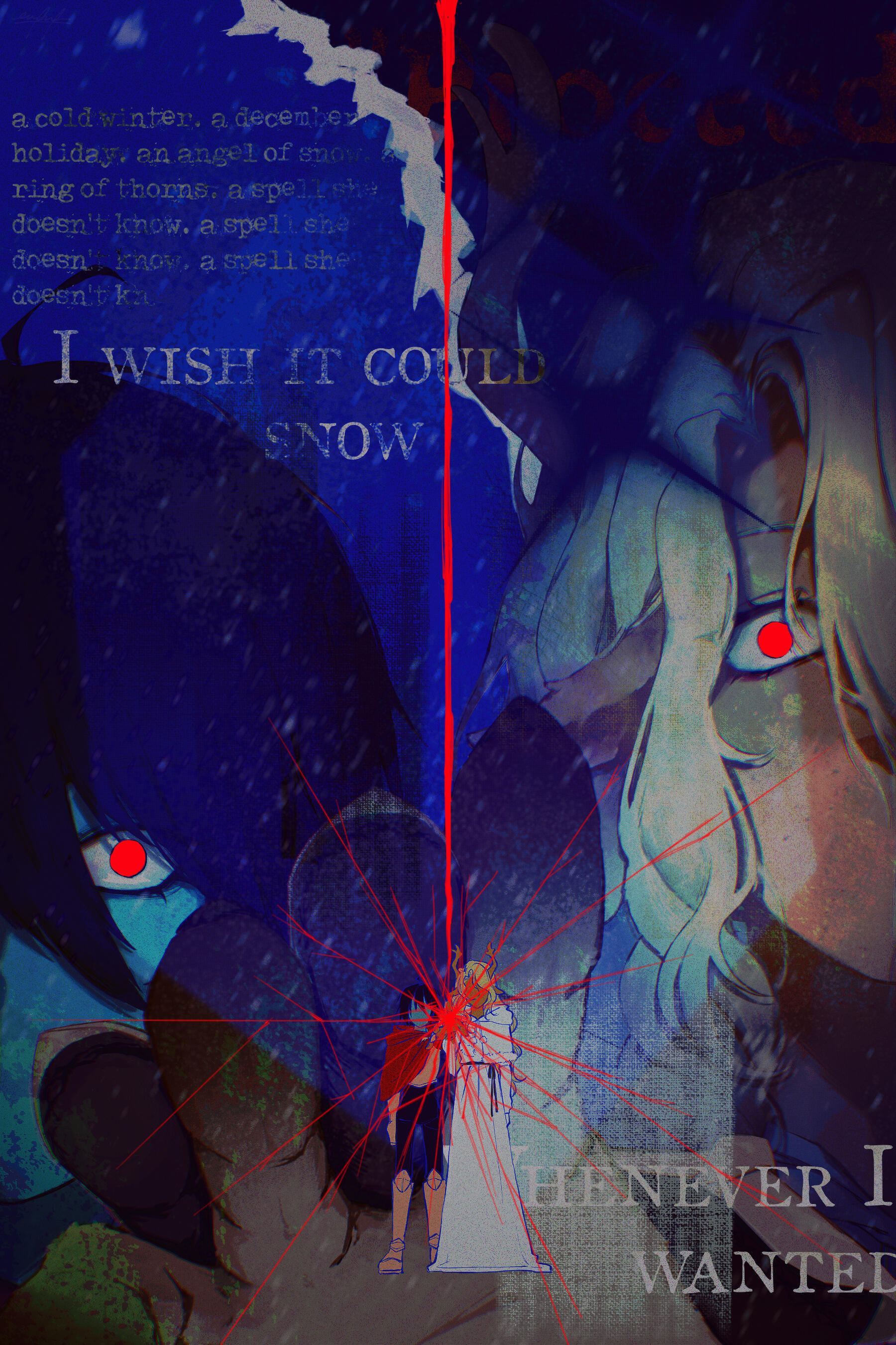 Berdly looked around, then just silently nodded his head and sat down. He set his axe next to him, causing it to disappear, rested his hands in his lap, and looked at Noelle again. She was broken down, fallen to her knees with the rough edge of her mage robe spilling out around her and almost glowing softly in the darkness of the alleyway. Every tear that still fell from her eyes froze to her fur. Her hands were covered in a thin layer of frost. Her eyes, so full of tears, were so devoid of life and color.He kept his distance, still processing the fact that he really had almost died just then. Even if this was all a really crazy dream, that was still terrifying. Kris had almost made Noelle kill him. Why would they even do that? What would lead to that? Sure, Berdly knew he could be annoying at times, and maybe he hasn’t been the nicest monster to Kris, and yes maybe he did like to mock them and hold his own ever growing friendship with Noelle in front of them like a dollar on a fishline, and he did like to tease them about their grades being low, and sure he–Okay, maybe there were a lot of reasons that Kris would be upset or dislike him, but them wanting to kill him was still crazy, right? Right?!?Noelle was staring at him. Maybe he wasn’t the nicest friend to Noelle, either.She had asked him to stay back, but something was compelling him to get closer. He could do better, surely. He could be better than he had been.He slowly shifted a bit forward, reaching his hand forward to rest on Noelle’s shoulder. He flinched back almost immediately from how cold she was, but he pushed through it. He placed his hand on her shoulder again, bit back and swallowed the cold. This was the least he could do.“You heard it… Didn’t you?” Noelle’s voice was weak, shaking. He was shocked she wasn’t stuttering on top of that. “Their voice... Tell me you heard it. Tell me I’m not crazy!”Noelle lifted her head, looking at Berdly almost frantically. Desperate for him to validate whatever she heard.“Yes, I heard it. Was there something wrong with their voice?”The words didn’t help at all. Her head fell once again, her entire body drooping closer and closer to the ground. Maybe she had made it all up. Maybe it was all in her head. All the enemies she had frozen, was it her own choice? Almost killing Berdly, was that her own doing?It all felt so vivid, though. She could hear their voice. The way they whispered into her ear, over and over as they walked the city. Proceed. Proceed. Proceed.Had she really made it all up? Her hands were so cold. She was so cold. Everything was so cold.Was any of it real?Noelle reached for the ring on her finger, yanking it off with a wince and throwing it across the alley. She watched as blood dripped down from where the thorns had barbed their way into her skin.“Surely, now... Now I can’t hurt anyone. Right?” Her entire body was trembling, even her gaze shaking as she tried to look at Berdly. Everything in her expression pleaded with him to confirm that she was now back to being a harmless deer.Berdly looked around. He was nervous. She could tell that much. He was scared of her, wasn’t he?“Well, I...” He stood up, not pulling his axe out now. There was a hesitation, but he stepped forward, his arms stretched out toward her. Berdly really wasn’t sure what he was doing, but he knew that Noelle needed proof that she wasn’t going to hurt him. This was not something he was used to doing, not something he ever had to do at all, really. He tried to think back on how his mom would comfort him in times of stress. Well, how she comforted him when he got a bad grade or lost at a video game. Which, in retrospect, was a very different level of distress from this situation.He sat next to Noelle, not touching her, but not too far either. “I feel fine. Don’t you?”Okay, maybe that was the wrong thing to say.Noelle let out a choked laugh, looking up at the pitch black sky above them.“Right. Do I feel fine? Should I feel fine? I could’ve been killing people for the past hour for all I know! I may have almost killed you! Is this even real? Is the pain in my hands real? The blood on my finger, the ice and frost on my fur, is any of that real?” Noelle started to fidget with her hands, picking at her nails and the skin around them mindlessly.“If this is some dream, that means we’re asleep. We’re asleep in the computer lab. Shouldn’t we be working on our project? We’re going to fall behind. We need to wake up now. We need to get out of here. I need to get out of here. I want to go home now. We can work on the project tomorrow, right?”Noelle kept rambling on as her thoughts came and went, her mind running far and wide. Berdly didn’t know what to say. He had never seen anything like this, especially from Noelle. She always seemed so put together, aside from when she was embarrassed about something. Was this a panic attack? Her breathing did seem heavy. How was he supposed to help with that? Should he grab her hands before she made them bleed more, but what if that made it worse? Maybe a distraction?That was it. A distraction. Berdly was hilarious, he knew this about himself. He could easily make her laugh, and then she would feel much better!“This is kinda like that scene from that one anime, don't you think?” He interrupted whatever it was she had been saying, grabbing her hands. That was something good to do during a time like this, right? Berdly looked at Noelle, who had completely stopped talking. Her expression was one of extreme bewilderment and confusion.“I'm... Sorry? What are you talking about?”Did he even have an anime in mind? He just said that on the spot. Surely one of the countless shows he was a complete expert on must have something relatable to this moment. “Oh, you know...” He had to think of something. He wasn't thinking of anything. How could he, of a people, draw a complete blank in such a crisis? “The G