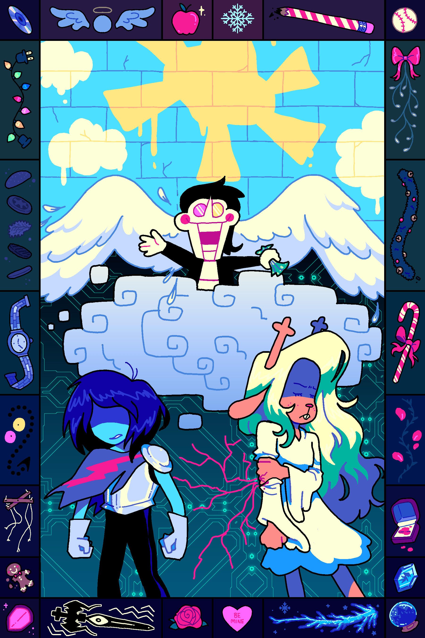 “But I’ve...never fed you grass...? Ah, wait a moment,” said Ralsei, catching Kris hovering by the cake, knife in hand. “I believe it’s customary to begin festivities with, er, blowing out the candles?” He considered the booming population of candles Lancer had stacked on his cake. “...Let’s just cut the cake first.”Susie parroted I believe it’s customary... in a low voice before going, “All right, Kris, hand the knife over.” She cracked her knuckles. “I’m going to annihilate that thing.”“I think it’s supposed to be me or Lancer,” said Ralsei. He thought about it for a moment. “I think I should do it,” he said hastily, and went to take the knife from Kris.They didn’t let go. “Ah, haha, Kris!” He tried again. They didn’t budge. “You...you can let go, Kris, I’ll get the cake cut and we can get on with things.”They looked at him. They smirked.“...If you let me have it, I’ll give you the biggest slice?”Perched now on Susie’s back, Lancer gasped. “TYRANNY,” cried the Prince-King of Card Kingdom. “CONSPIRACY, UNDER MY NOSE?” Susie paced over to them so Lancer could hang his head over Kris and Ralsei disapprovingly. “Not on my watch,” he sniffed, and yanked the knife from Kris’s willing hand.Susie watched enraptured as Lancer held the knife high. “Hey, is it possible for darkners to open fountains?”In the instant where Lancer plunged the knife into his behemoth of a cake, Ralsei suffered terrible visions; but of course! Nothing happened.(Well, this was Lancer. There was always a chance.)They managed to get through cake distribution without further injury, which Ralsei was thankful for. There was a brief hiccup where Lancer was reluctant to have the Card Castle cake cut, but he was more than happy to plop the little fondant figure of himself into his maw when Ralsei reassured him they could bake another one together.“All right,” chewed Susie, more consonant than conversation. She’d devoured half her plate in one bite. “You know what time it is!”“TV TIME,” blurted a Pippins. “...Sorry. Reflex.”“Time for gifts!” Susie snapped her fingers.