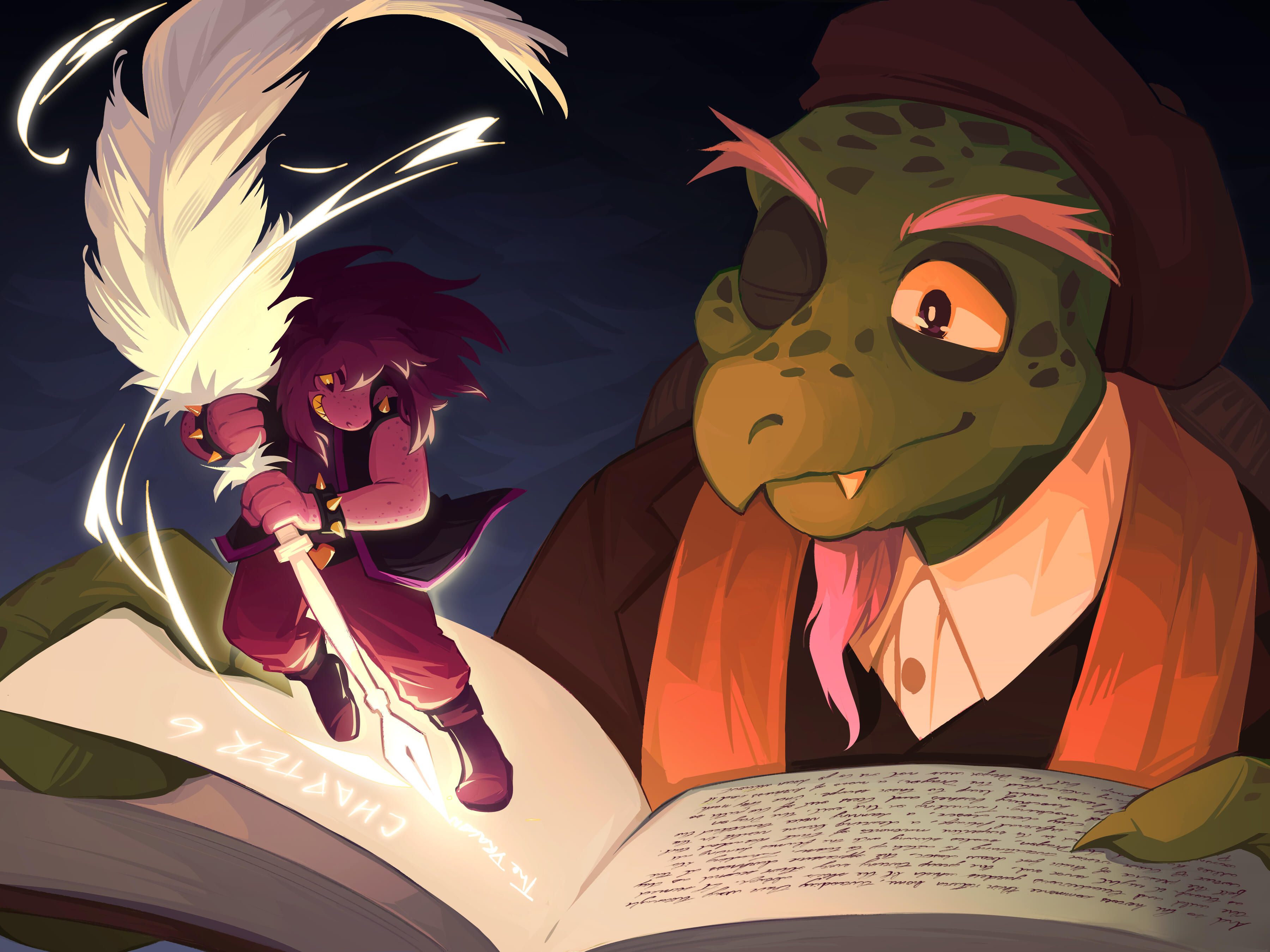 “Maybe you're right,” said Ralsei. “I should dig him a hole. Susie, could I borrow your axe for a moment?”Susie laughed and choked on the cookie. Ralsei hovered a hand over her as she hacked up a chocolate chip and swallowed it again without missing a beat. She tried a nonchalant lean and wheezed out, “What sorta gift did you get him, anyway?”Ralsei eyed her. “It’s meant to be a surprise,” he said.She blinked at him. “Yeah?”“You won’t cave if Lancer asks you what it is before I give it to him?”“No way!” said Susie. Ralsei leveled a wry look at her. “...Nooo wayy,” she said again, and stood straighter, resting her hand on his shoulder. “Look, promise I won’t!”Ralsei considered. Susie began to shake him, chanting, I promiiise I promise Rals I won’t breathe a word not even if he offers me a Lancer cookie or worms or another fan. “Okay! Okay, let me just go get it...”There was a knock on the door. Ralsei froze mid-step. “That must be him,” he said, and straightened up, brushing his hands over the front of his robes. “All right, everyone, to your places! Swatch, if you could please dim the lights—”CRASH! The door slammed into the wall.