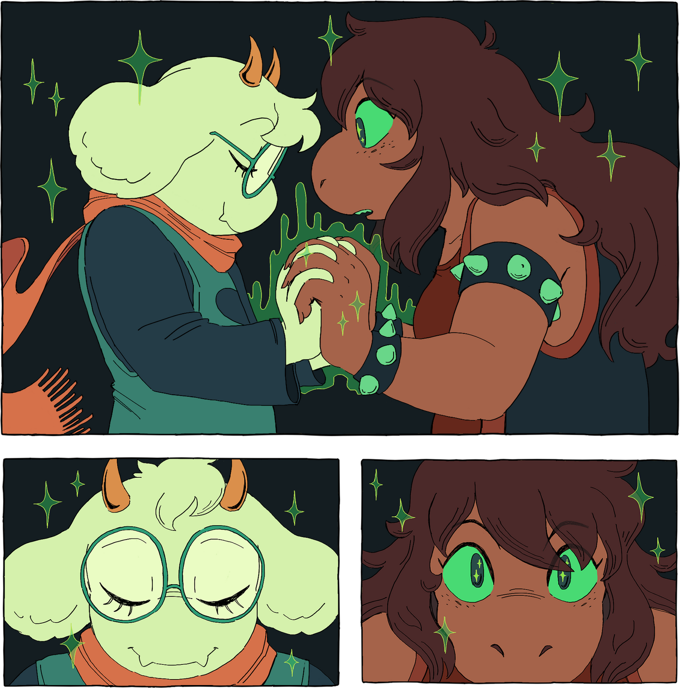 There is that same pushback she felt with Kris now as Ralsei gingerly cups her hands in between his own and coaxes some asspull power of friendship method to generate green light. It bobs gently, just like Ralsei—almost ethereal, so transparent that she’s afraid it’ll blow away. Then it blooms. Bright. Unapologetic, so unlike Ralsei.A curl of annoyance flickers in Susie. I want to be able to do that, she thinks, and then almost automatically, the next thought strikes: I can do that.Ralsei’s releasing her hands and yammering about something possibly important, but Susie’s too focused on the warmth that’s beginning to jet from her heart and pool into the palms of her hands. It’s not the razor edge of adrenaline that warps her fists into weapons that greets her, but the abstract warmth she feels when she’d messed around in the church with Kris, when she’s traveling with Ralsei and Kris, when she did shenanigans with Lancer...For all that emotion, though, there’s only a tiny spark that jets out like a firework. Her teeth grind into her tongue. Not good enough.But Ralsei’s grinning in that wide endearing way of his, and even Kris is giving her a lukewarm thumbs up that translates to high merriment in Kris terms. Susie cracks a smile of her own.Not good enough, but a start.